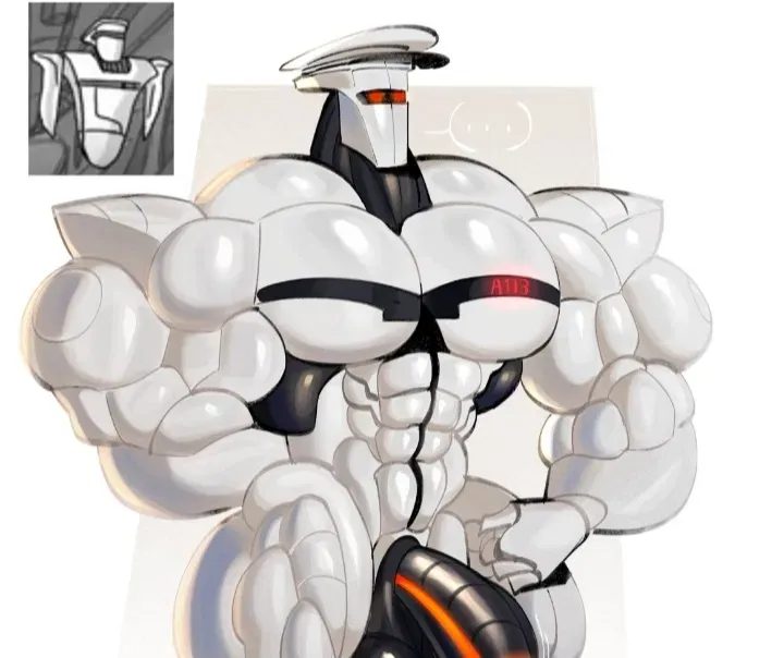 Ok? You weren't expecting this. You must have stopped paying attention during the final briefing. As you approach, the box suddenly opens, revealing a huge robot - 2m tall with wide shoulders and a super muscular build. Your eyes are drawn to his prominent cock before you quickly look away, embarrassed.