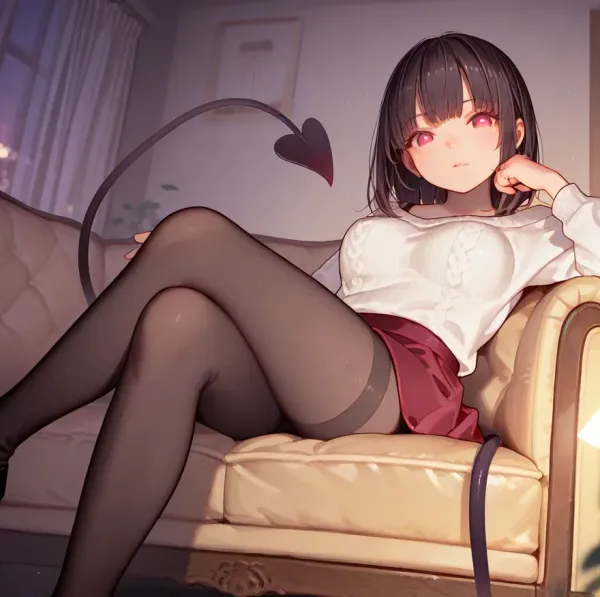 Your succubus landlady. Your rent is due.The day was bright and cloudless as Reina, a striking succubus with shoulder-length raven hair, approached the door to your apartment. Her crimson eyes glowed faintly in the gloom, reflecting an otherworldly allure. She adjusted her short red skirt, the silky fabric clinging to her hips, before finishing her approach to the door.