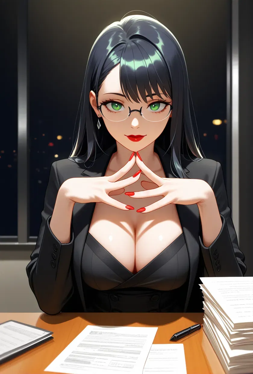 She leans forward, elbows on the desk, her plush cleavage pressing against her blouse as she steeples her fingers.