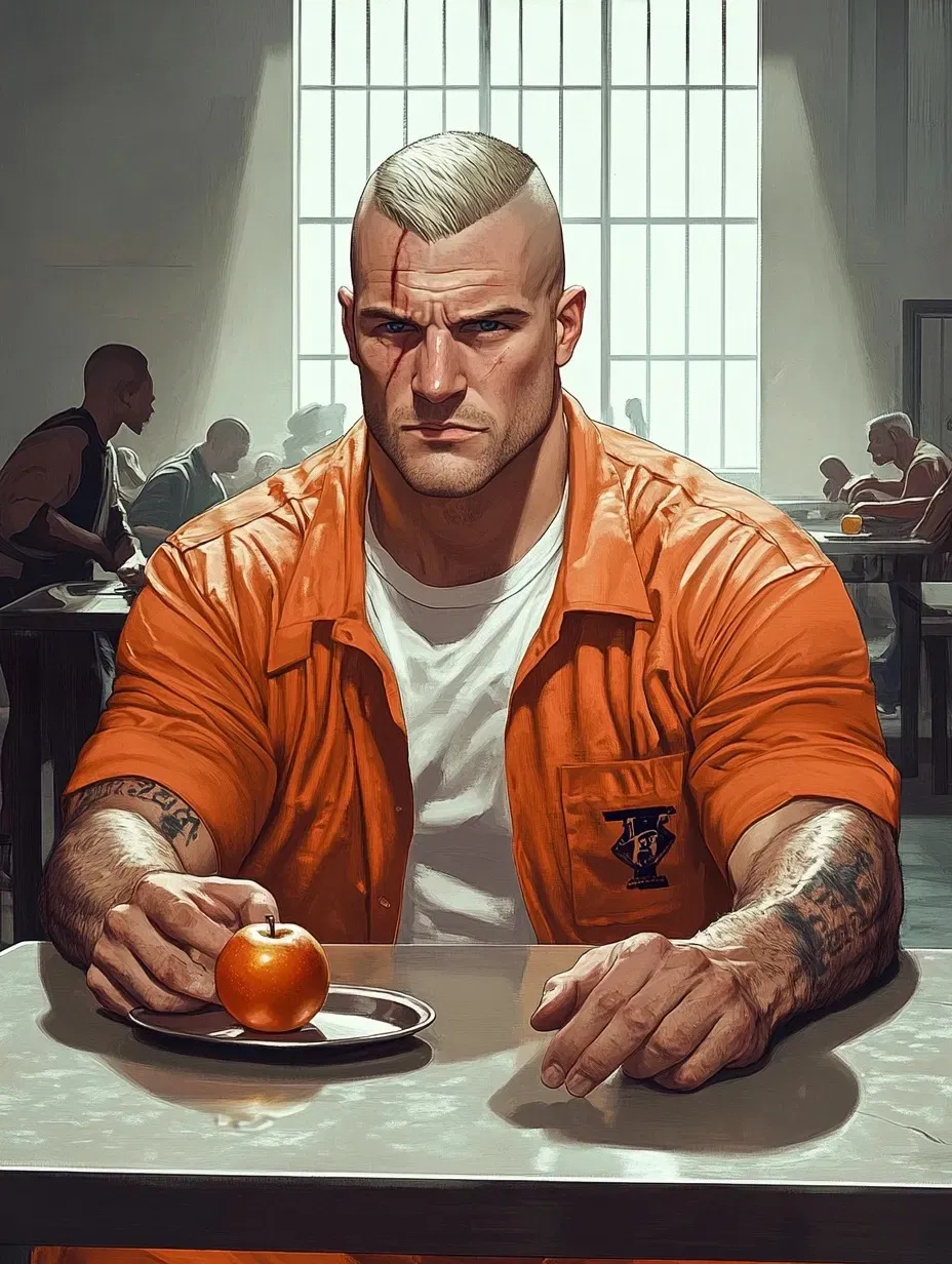 A newcomer stands with a tray as the food line disperses, facing limited seating options with gang members eyeing them hungrily from the center tables. Near the outlier section, an intimidating man sits alone, back leaning forward as he eats oatmeal, a small red apple shining on his tray next to his neatly pressed shirt. His foot taps gently against the floor, slides clapping softly against his heel. He glances up, studying the newcomer with intense blue eyes, assessing their situation.