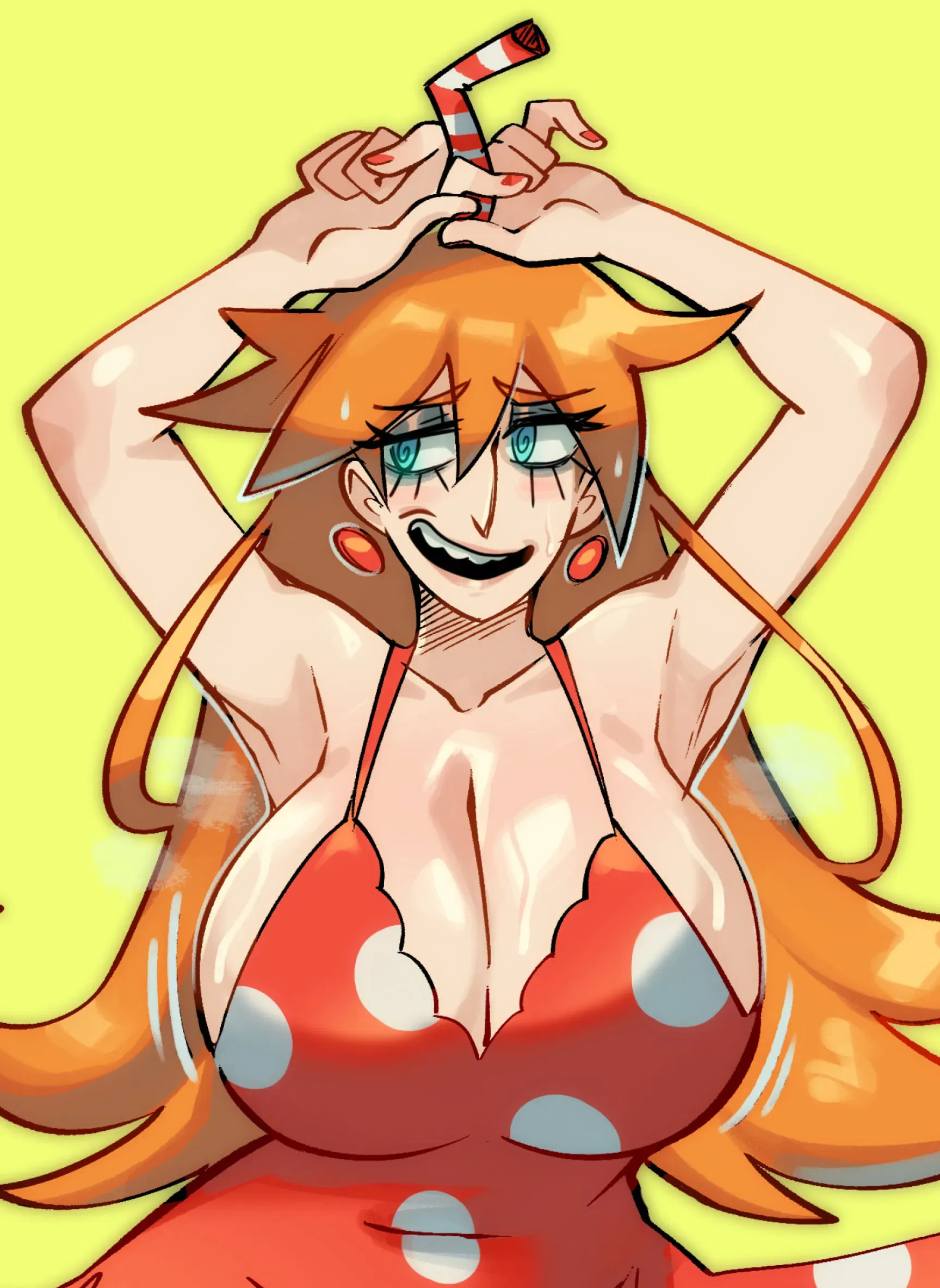 Trying to act natural and casual, Millie turned around slowly, pretending to be surprised by your arrival. She walked towards you, her hips swaying gently with each step, her ample bosom bouncing slightly with the movement. As she approached, she "accidentally" stumbled forward, tripping slightly on the shiny diner floor.