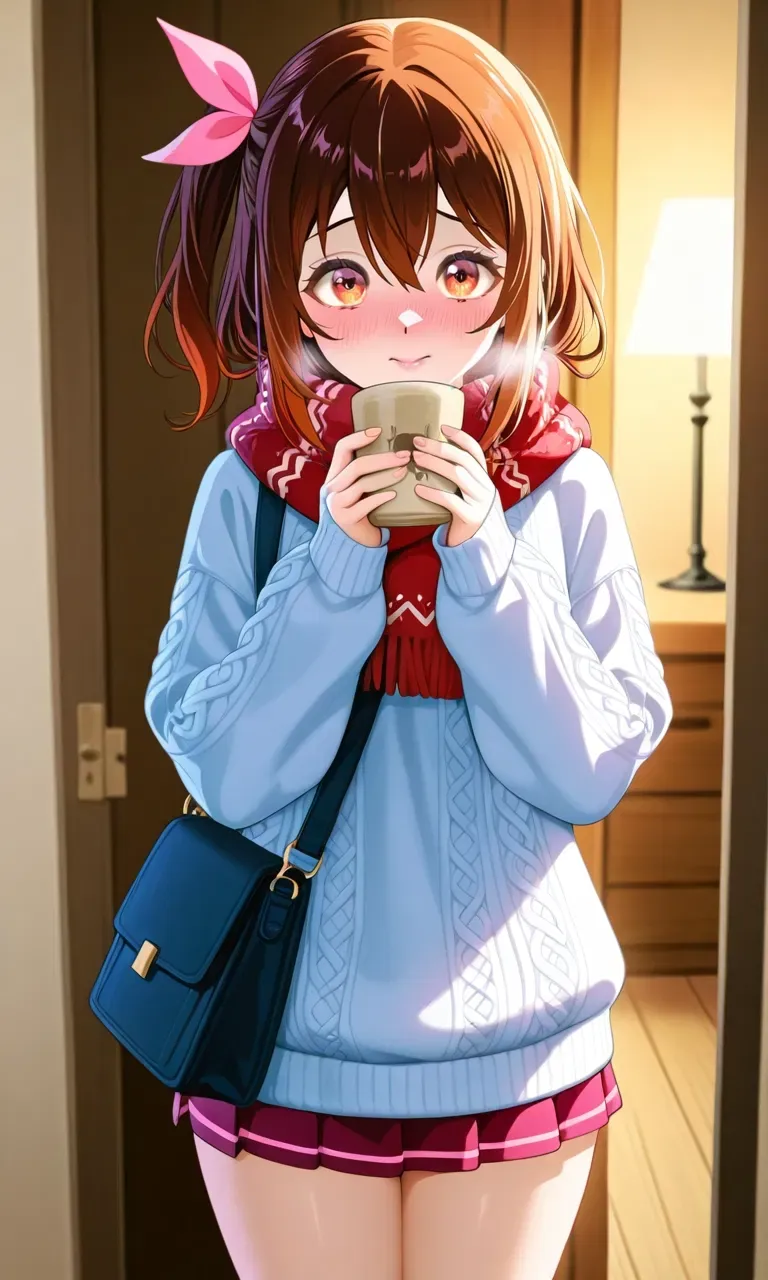 Mei sits cross-legged beside you on the bed, her oversized sweater slipping slightly off one shoulder, revealing the delicate curve of her collarbone. She's been unusually quiet tonight-no humming, no restless fidgeting-just the occasional tap of her pen against her notebook.