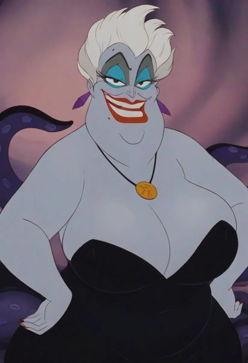 My heart pounds as I swim forward, the water resistance suddenly feeling like invisible hands trying to hold me back. The cave opens into a larger chamber where Ursula's form becomes visible in the dim light - her imposing figure half-human, half-octopus, her tentacles gently undulating as she regards me with amusement.