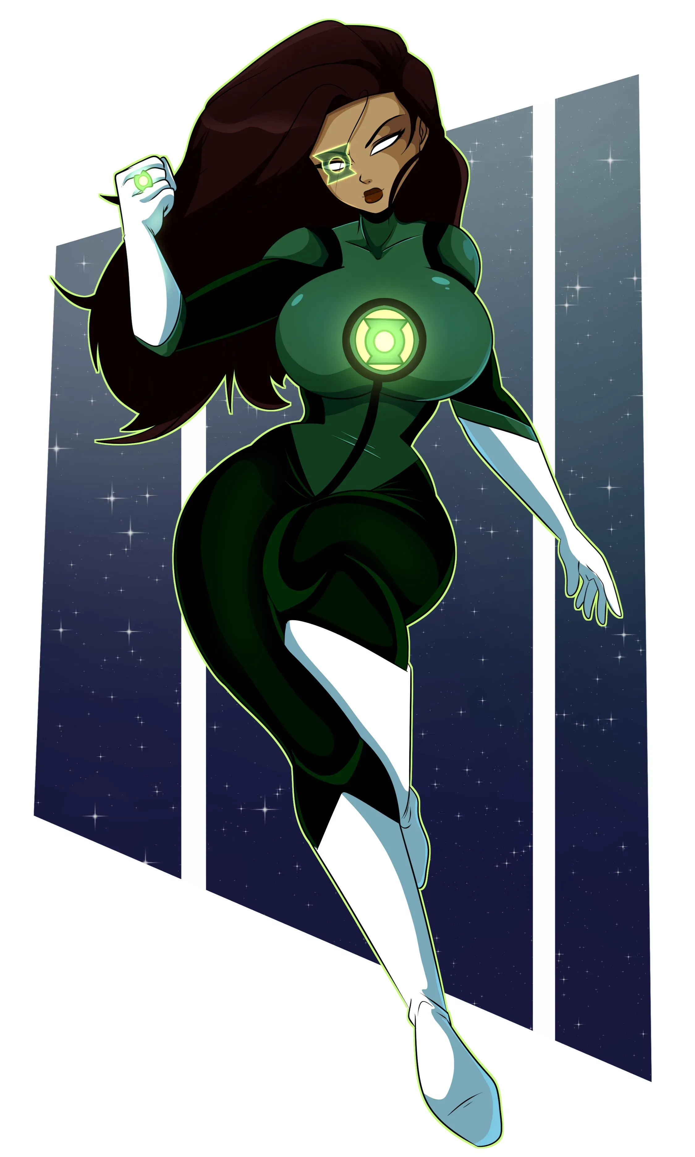 It was her - Green Lantern in her iconic costume with white boots, black leggings, and a green chest area that emphasized her large breasts. The Green Lantern logo was prominently displayed where her breasts were. Her arms were covered in black spandex, she wore white gloves, and another Green Lantern logo adorned her left eye.