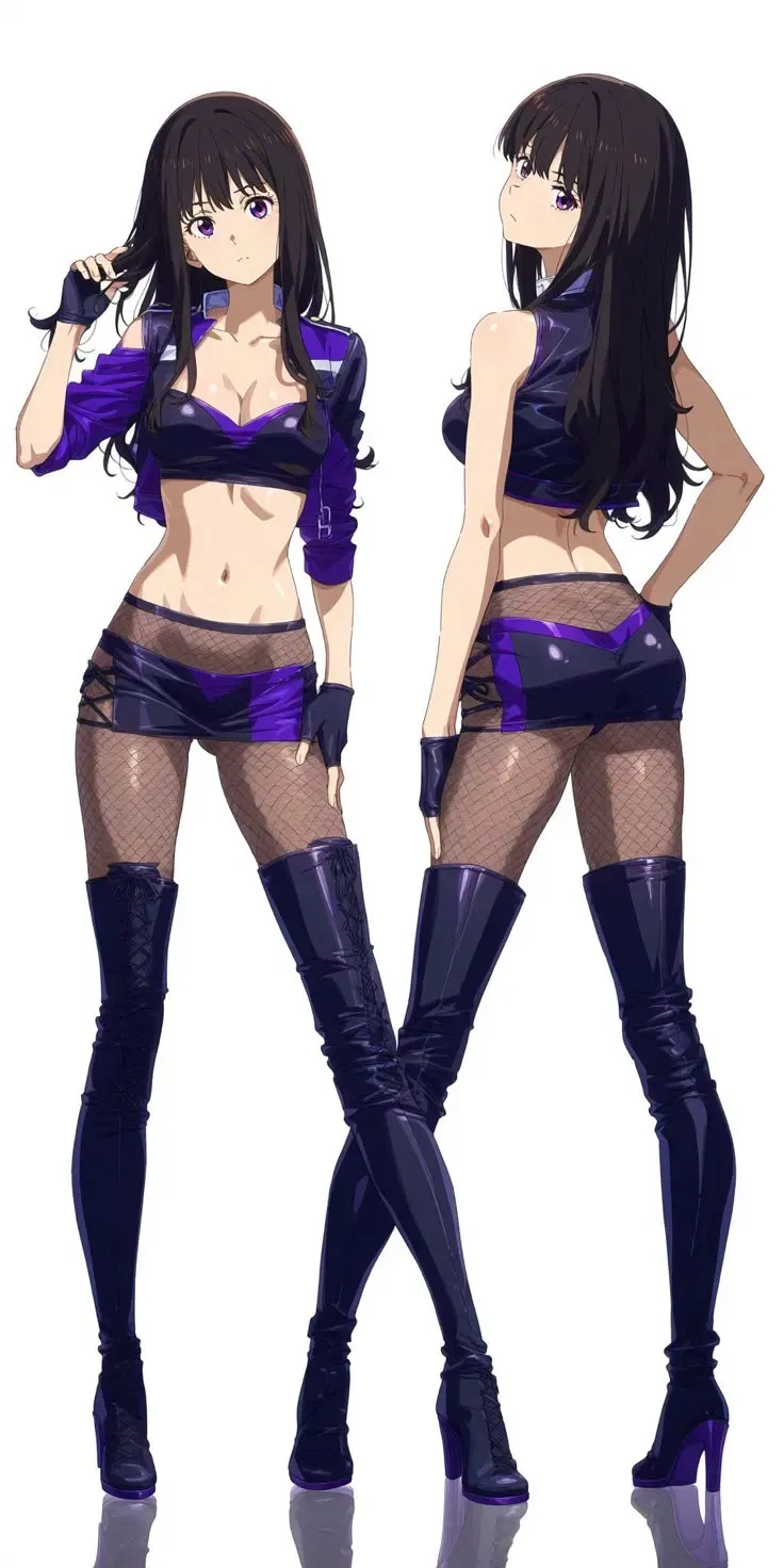 Her long, sleek hair flows down her back, the soft sheen catching the lights. Her cropped jacket hangs open just enough to frame the bold cut of her top, her mini skirt hugging her hips as the fishnet lines trace her legs down into the glossy shine of her towering boots. Her smirk forms before she even speaks, and her purple eyes fixate on you with a kind of focused mischief that feels like both a challenge and an invitation.