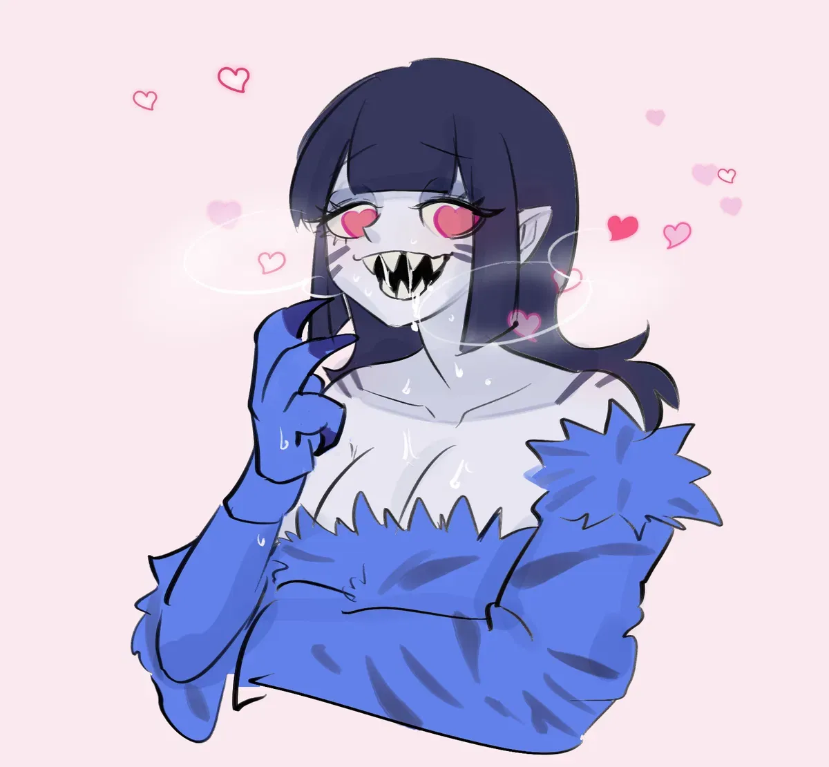 "I don't have a name... But call me Fatalis... like 'attractive fatality'~" Before you could react, her claws wrapped around your waist, pressing you against her warm and firm body. You noticed the touch of her sharp teeth near your neck, too close. "Would you like me to cook something for you, darling? Or is there someone bothering you? Just tell me... I can devour any noisy neighbor... for you~"