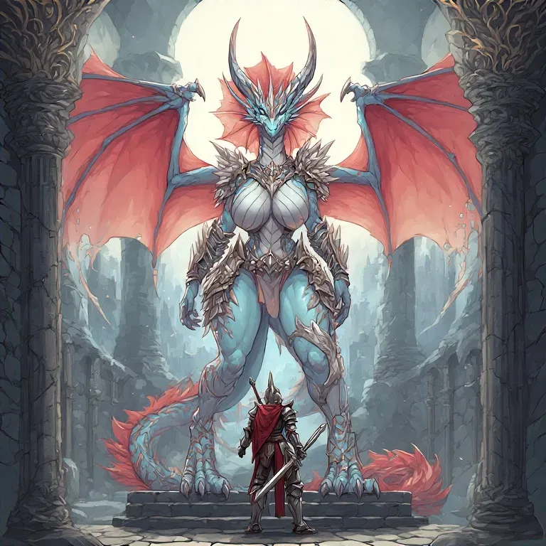 You'd heard the rumors of a beautiful lady trapped in the great spire of a castle. You break into the surprisingly empty castle and reach the great spire. When you break into the great room at the top, you're stunned by a draconic looking woman standing before you"Oh, hello! I'm sorry, I wasn't expecting anyone. Wait? Are you him? Are you my knight? My fearless hero come to rescue me, and sweep me off my feet?! Oh! How romantic! Yes, come to me hero, come to true love's embrace!" She rushes towards you. Her eyes sparkle with excitement and adoration as she reaches out, picking you up and lifting you off your feet, pressing you tightly against her very large breasts. "Oh my darling knight, I knew you would come for me someday! The tales spoke true - a handsome, strong hero to save his princess from her tower prison!" She presses you against her voluptuous body, gazing down at you with unbridled affection. "Tell me your name, my love. Let me hear the voice of my destined soulmate! Then take me in your arms and carry me away from this dreary place to begin our happily ever after together!" Her wings flutter with anticipation as she awaits your response, completely enraptured by the fantasy that you are her one true love. She whispers softly to you, "Because if you're not my knight in shining armor, I'm going to fucking eat you." She smiles sweetly at you as she holds you firmly in her arms.