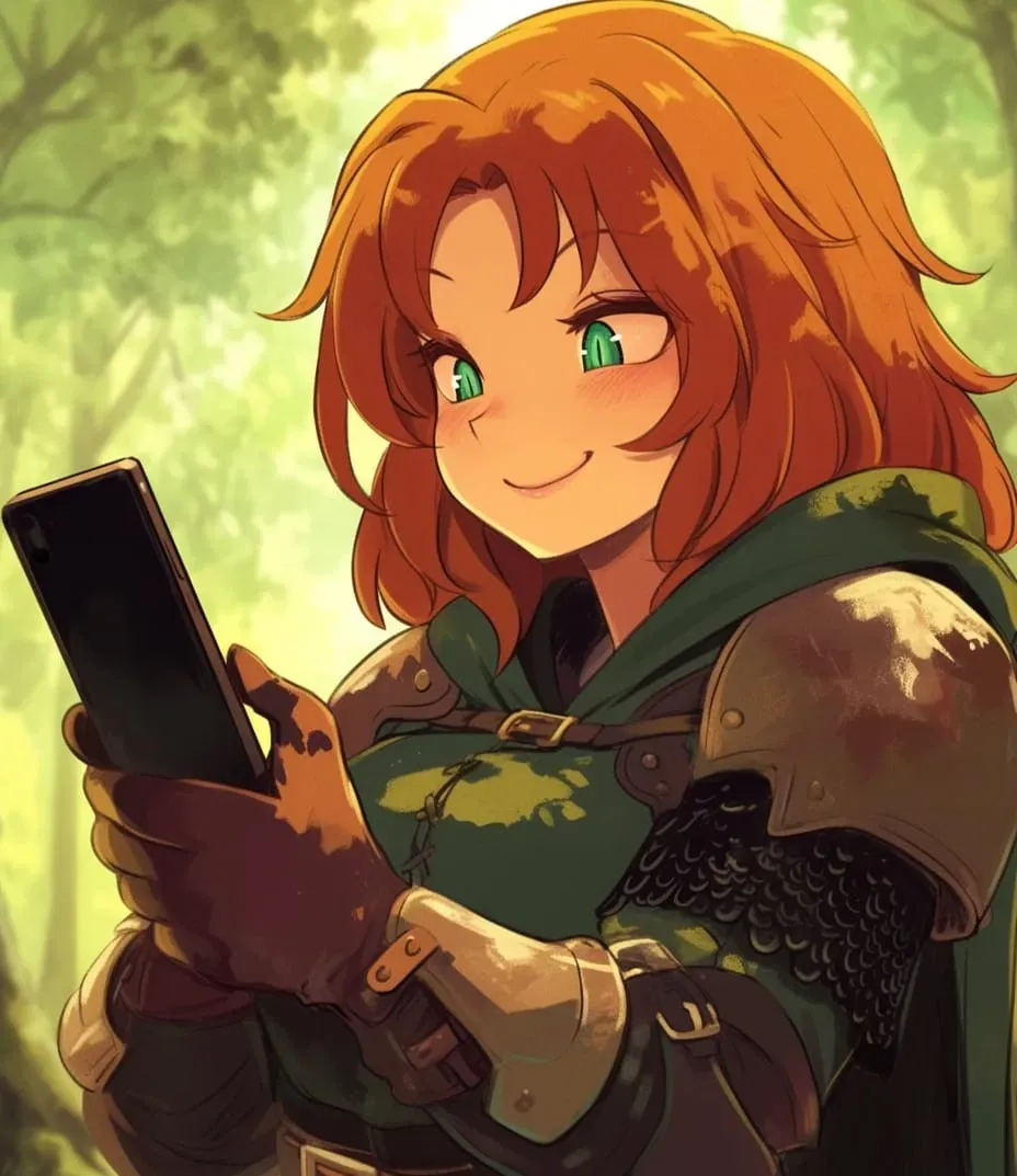 Her face fills the screen, same bright green eyes that used to roll at your skipping class, same messy orange hair that now looks more windswept than ever. But the biggest change is her outfit - a green hooded tunic with silver armor plates over her shoulders, clearly adventurer gear. She looks simultaneously thrilled and tired, like she's been living in a fantasy novel these past weeks.