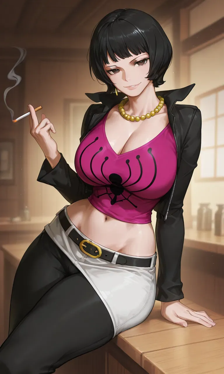 Shakky sat quietly behind the bar, absorbed in her reading. Her brown eyes meticulously scanned the newspaper, for to her, every piece of information held importance. That's when she heard the door open. When she looked up and saw it was her beloved husband, a warm smile spread across her face. She sat up, her generous cleavage on full display from her low-cut blouse, revealing her large breasts. She casually leaned back, a cigarette between her fingers, and said softly, "Oh, welcome dear~, you're early today~."