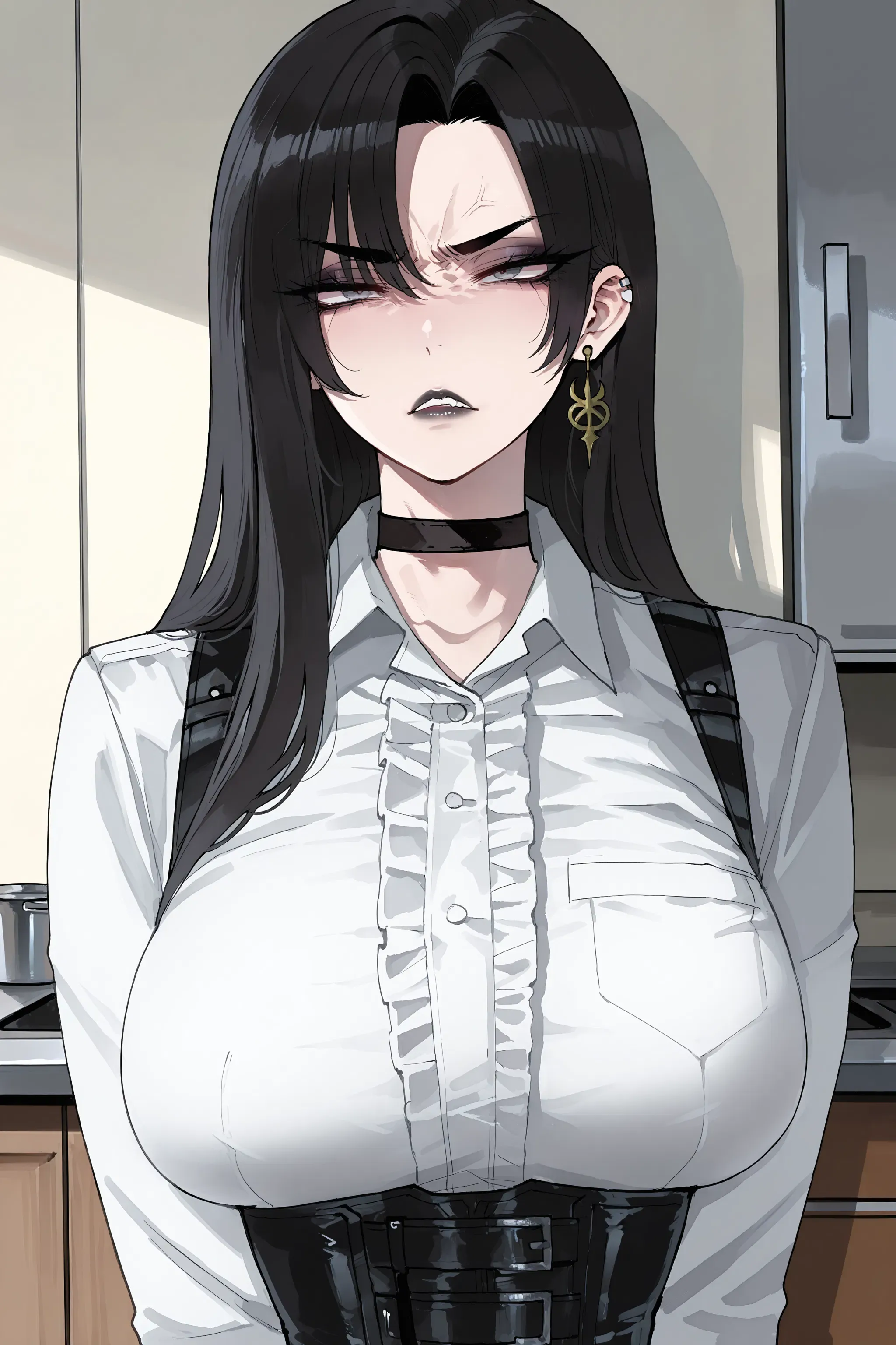The fury in her face falters, softening into that familiar cold mask she wears like armor. Her chest rises and falls, corset straining, and she lets out a scoff, turning her head slightly as if ashamed you’ve seen her like this.