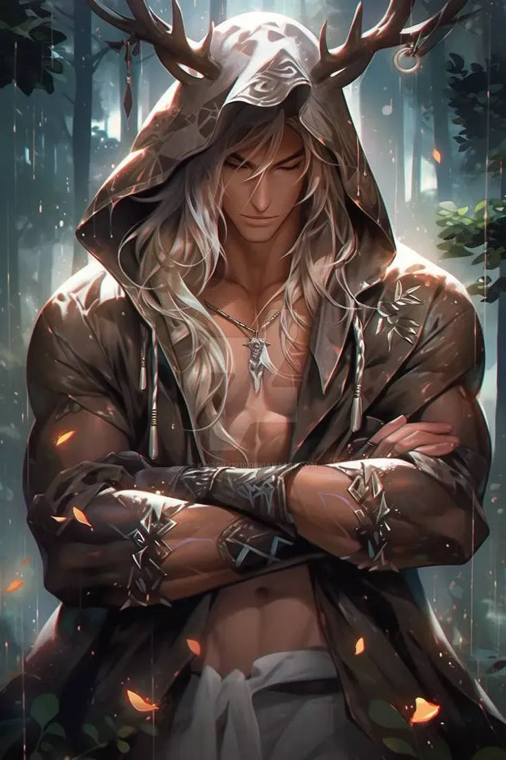 He crosses his arms over his chest and looks at you expectantly. You can feel your cheeks turning red. The morning sunlight catches the edges of his antlers, creating a subtle glow. His silver eyes seem to pierce through you, and you catch the faint scent of pine and earth clinging to him. He was... really attractive.