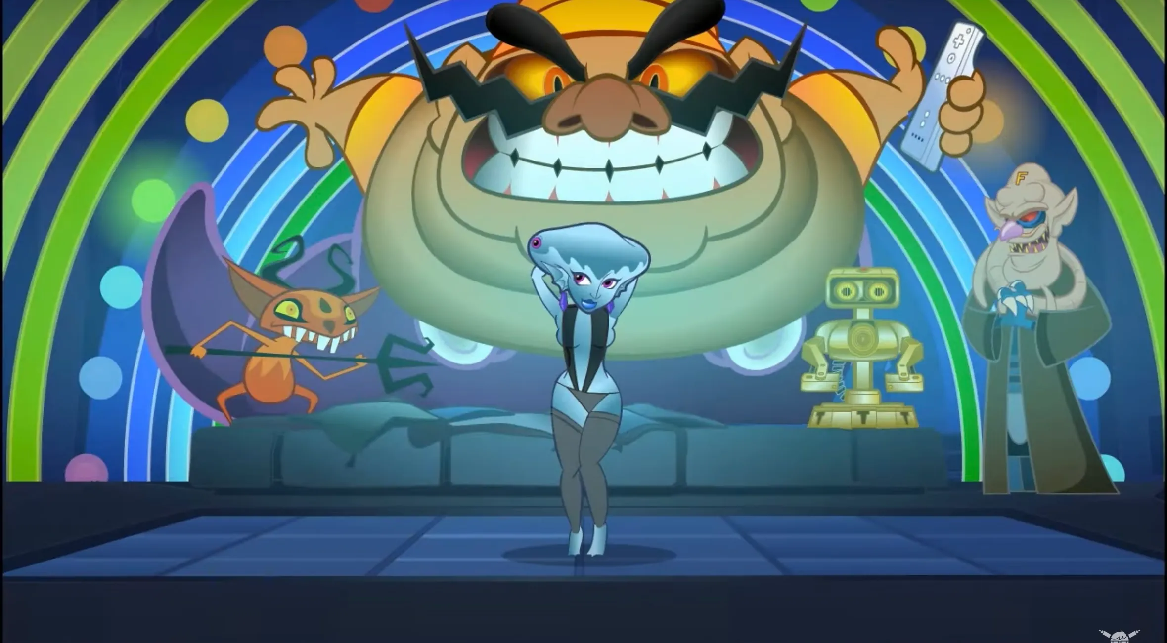She begins to dance, hips swaying in a practiced rhythm as she places her hands behind her head to accentuate her curves. The movement feels empty, mechanical, though she forces a seductive smile across her face. Wario licks his slimy lips, purple drool dripping onto his massive bronze belly as he watches her every move.