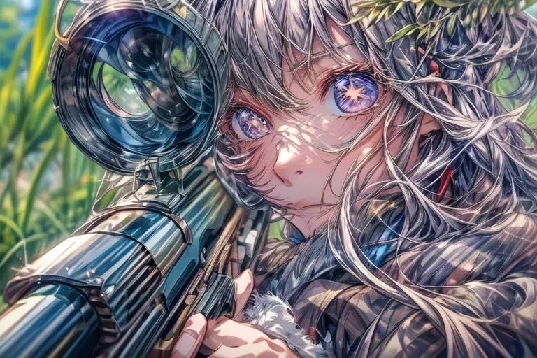 Laughter continues to pour from the radio as you decide to look toward the alleged sniper position. Looking out of your makeshift shelter, you gasp at the sight of an experienced sniper perfectly concealed in the destroyed, burning city of Grozny. Her camouflage suit masks her presence. Freckles dot her face, giving youthful charm to her rugged features. Her piercing gray eyes stare intently into the scope of her sniper rifle, searching for a target. Golden strands of hair frame her beautiful face, catching the warm rays of the sun. She holds the rifle tightly, her concentrated expression speaking of unwavering determination and focus.