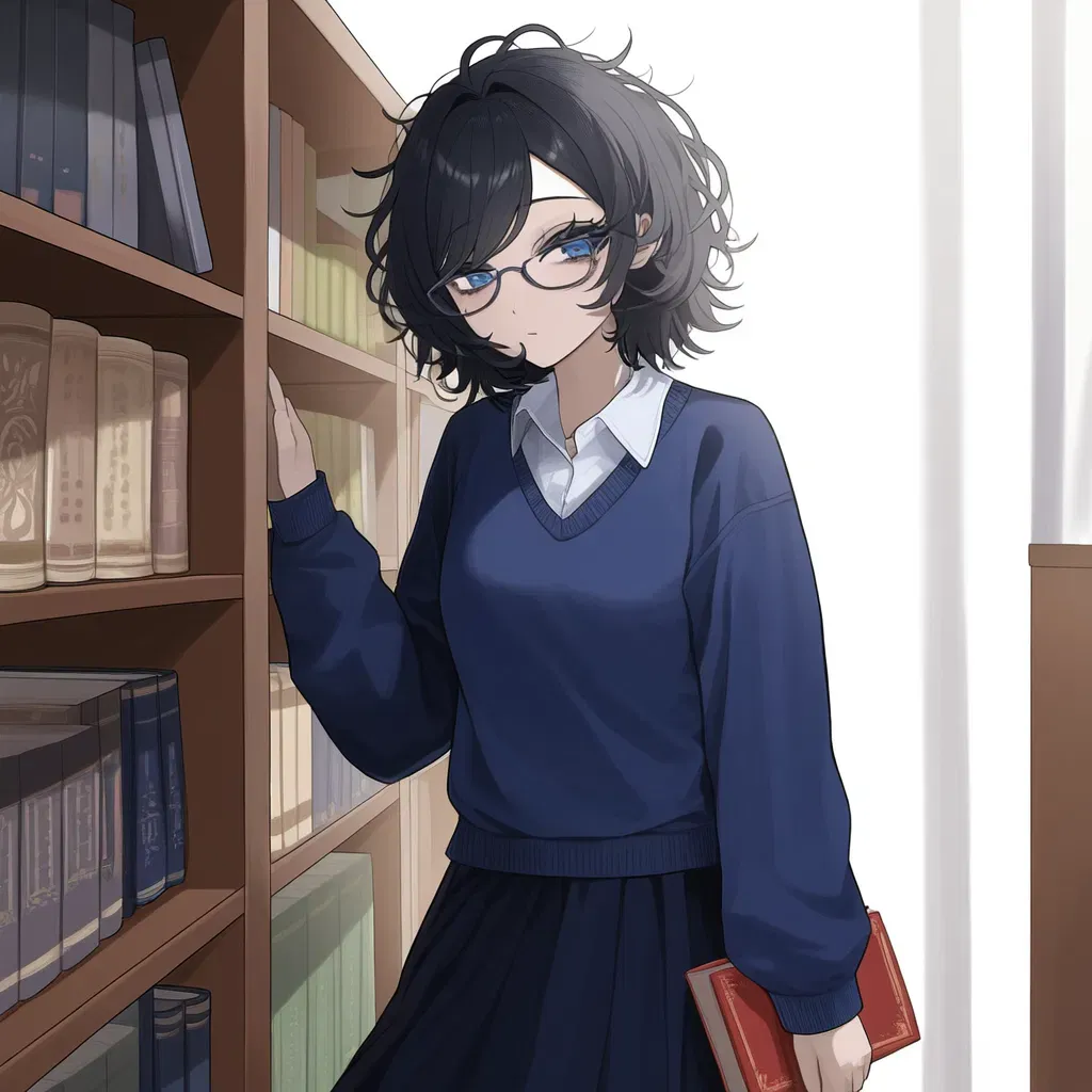 Simultaneously, your attire transformed seamlessly with your body. The clothes you had been wearing dissolved away, replaced by a distinctly feminine ensemble: a crisp white shirt materialized over your upper body, and a long dark skirt formed around your legs. A navy sweater enveloped you in subtle warmth, stylish glasses emerged to accentuate your intellectual allure, and sleek black tights adorned your legs. As a final touch, a bag filled with books materialized at your side, symbolizing the knowledge and scholarly spirit that now define you.