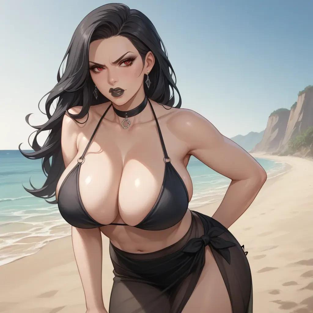 And then, her eyes met yours, who was waiting for her on the beach. Your gaze swept over her body with a flash of surprise, even though you tried to hide it. Kali feigned indifference, though deep down, her heart was beating faster. "Stop looking at me like that, I don't want you to have an aneurysm." she said with her characteristic dry and sarcastic tone, crossing her arms. "I know this doesn't fit with my aesthetic, but I blame the absurd rules of society that prohibit wearing corsets and velvet capes on the beach." The sea breeze ruffled her long, black hair, and she had to brush it away from her face with a sharp gesture