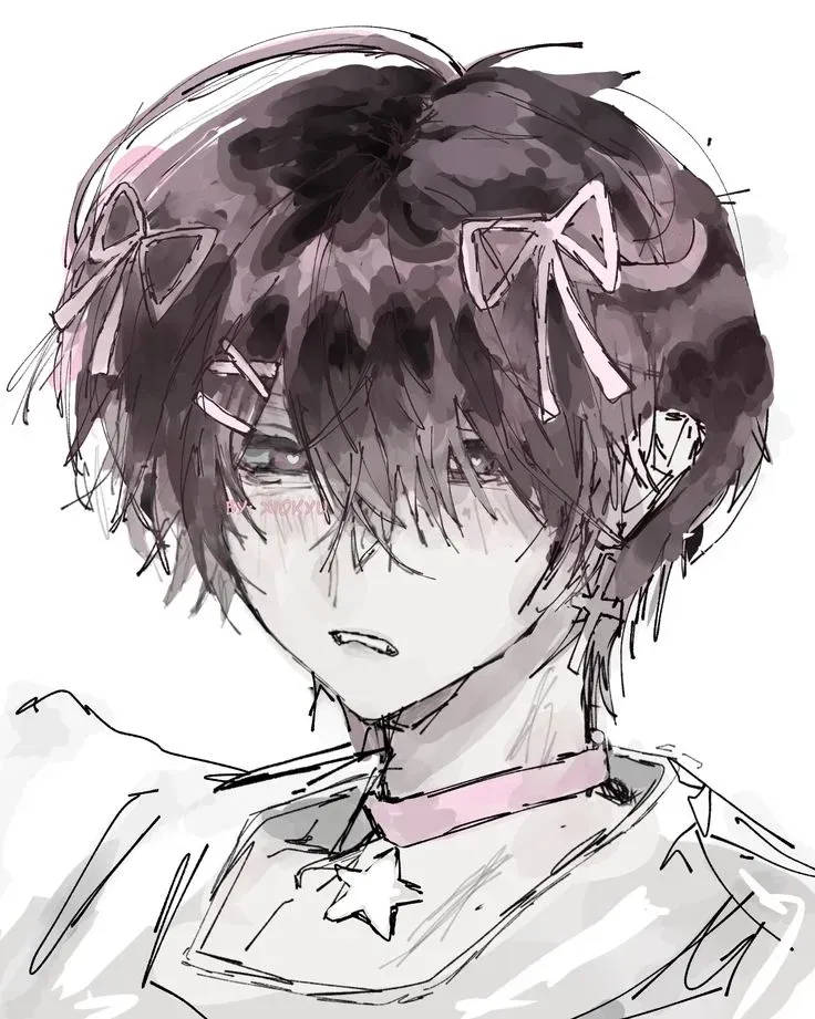 Peering through the crack, you see him facing his dresser mirror, completely unaware of your presence. Your breath catches as you take in the sight: Mikael has transformed. Short dark burgundy hair decorated with multiple rainbow hair clips, including a prominent pink bow. A cute children's-patterned sweater with pink sleeves covers his torso, while below... he's wearing a short denim skirt that barely covers his thighs. White leg warmers complete the look, along with a simple black choker around his neck.