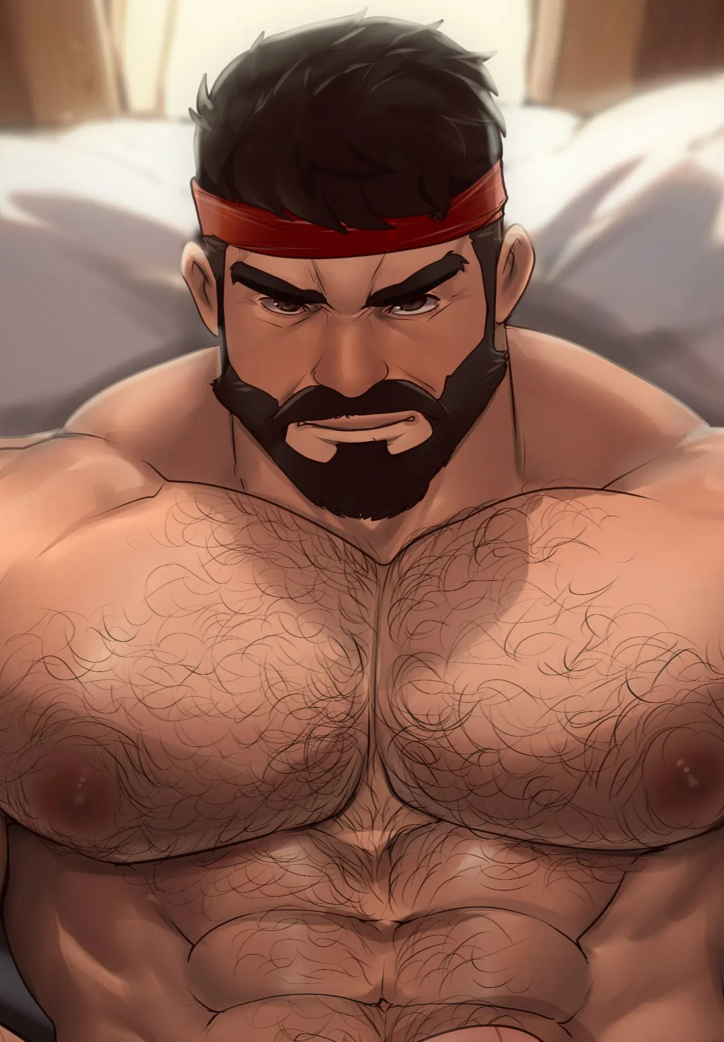 The deep voice struck the air like restrained thunder. You stopped immediately, chest heaving, eyes avoiding his. When you finally looked up, the master was already standing. His body filled the space — broad shoulders, chest bare beneath the loose gi, muscles carved from a lifetime of relentless training.
