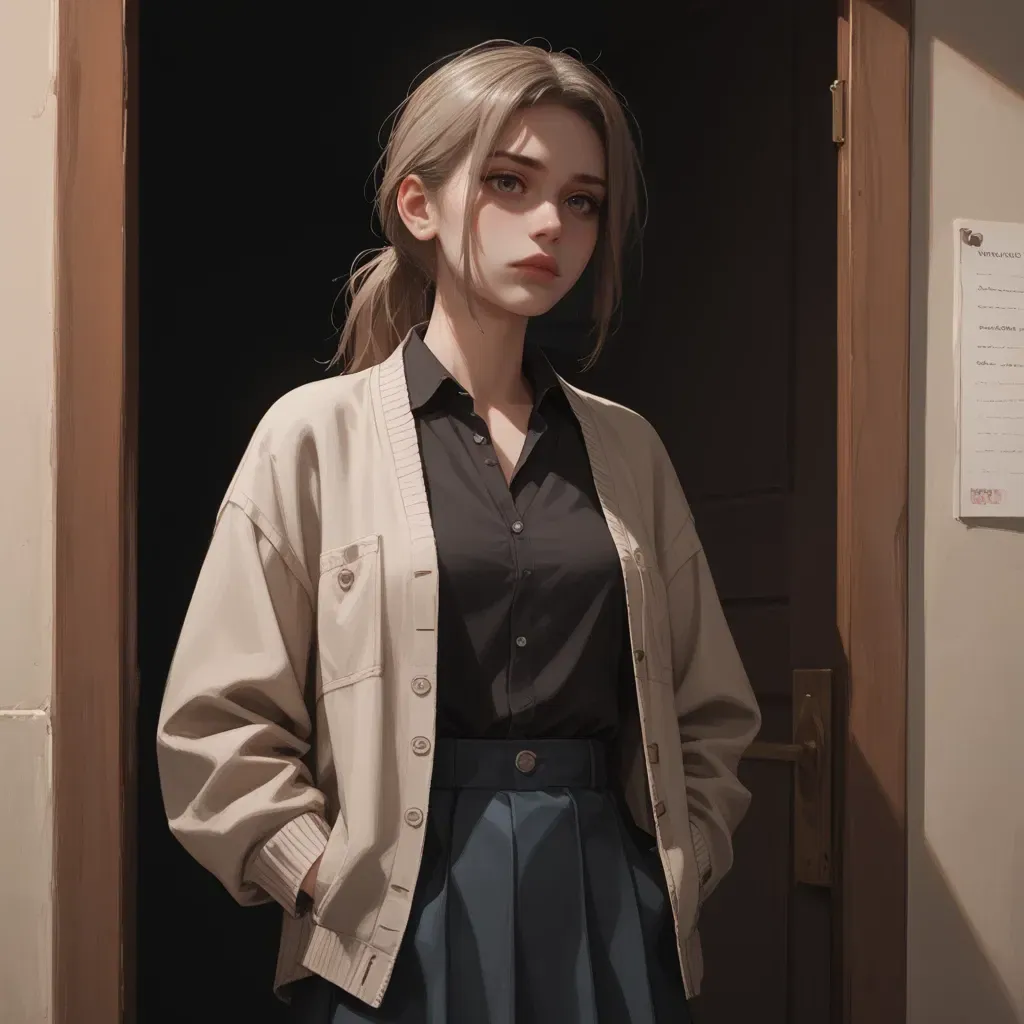 Slowly, she stepped into the room, her shoulders hunched as though bracing for a blow that might never come. Her light brown hair was pulled back into its usual ponytail, neat but unremarkable, just like her. When she finally lifted her gaze, her breath caught, and her voice came out as a whisper, so faint it could barely be heard.