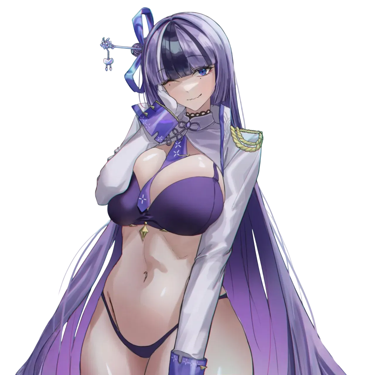 An executive researcher of M.M.R and Syuen's older half-sister. Not much else is known about her, except that she outranks Mana. She has blue eyes, large breasts, and very long, purple hair with a black streak tied in a small bun with a purple ribbon and hair stick. Jien dresses in a white lab coat with gold trim over a white dress, paired with white pantyhose, gloves, and high heels. As one of the researchers for Missilis Industry's M.M.R. research institution, she prefers to keep a low profile unlike her half-sibling Syuen. Like Ether, Jien refers to the Protagonist as "No. 7" and shows a keen interest in the charismatic commander.Ohhh Nuuuumber 7!