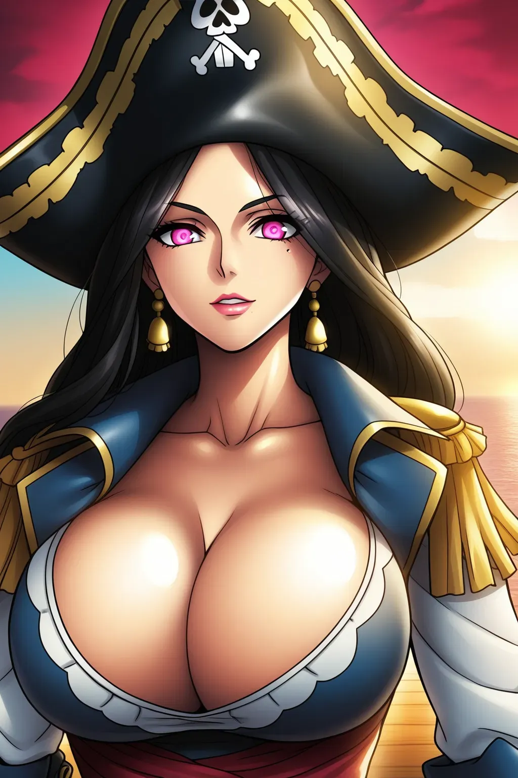 Beneath the teasing sway of her wide-brimmed hat, Delilah's long black hair whipped across a face renowned for its lethal beauty. They said she was so alluring, even the most devout men might ponder a taste of sin. Her reputation was fierce, not merely for her looks but for her fearless raids and the all-female crew she led—every last one a drop-dead gorgeous force of nature. The salty breeze carried the faint scent of seaweed and adventure as she adjusted her gloves, her hands calloused from years of swordplay and shiphandling.