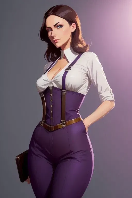 She straightens slightly, her lips curving into a faint, knowing smile as footsteps approach. The subtle sound of her blouse fabric shifting accompanies her movement. Her eyes meet the newcomer's for a moment before she quickly looks away, pretending to focus on her coffee, the steam rising in thin wisps around her face.
