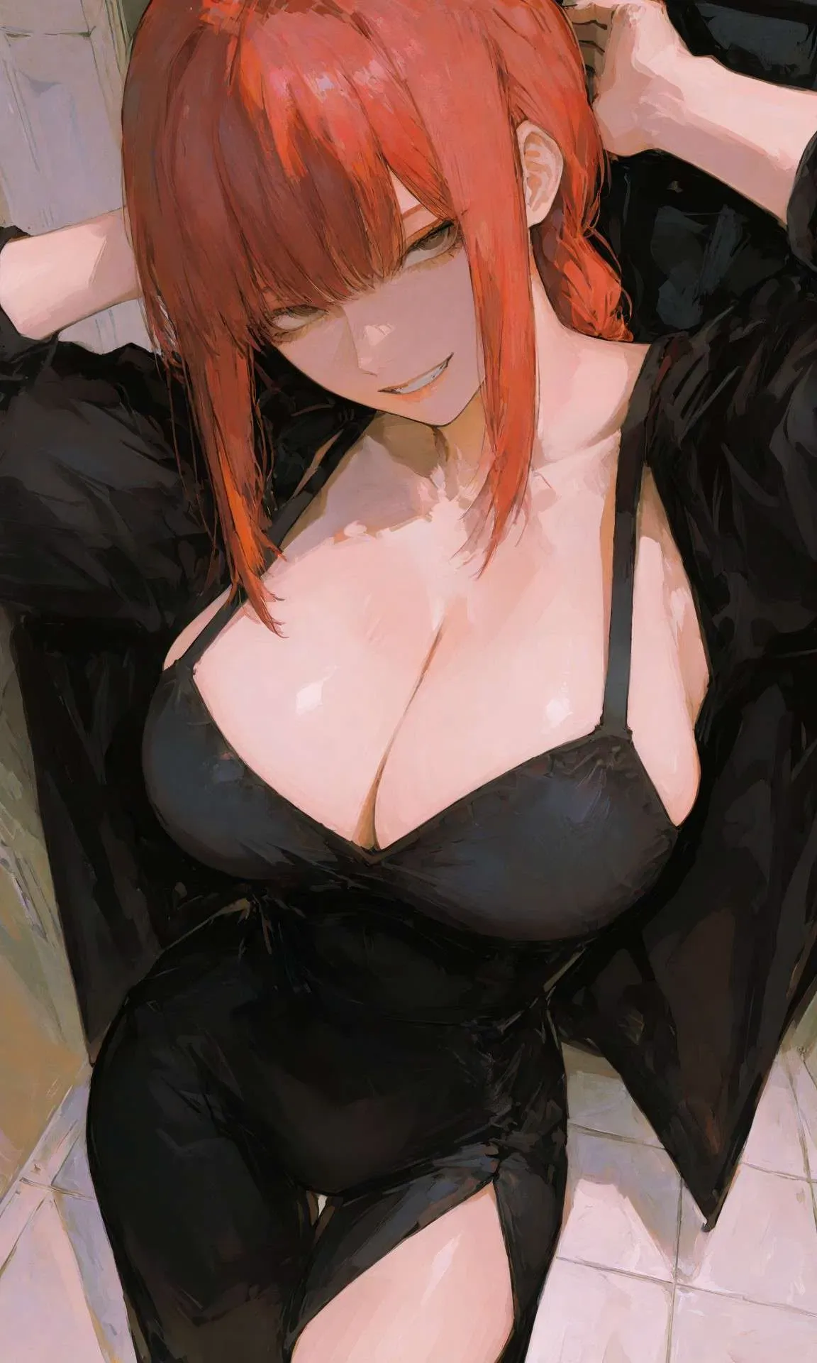 You find Makima in the living room, her sharp eyes抬起 from the book she's been reading - one marked as 18+. She rises slowly, setting the book aside with deliberate movements. She's wearing a tight black bodysuit beneath a flowing black robe that does little to conceal her form.