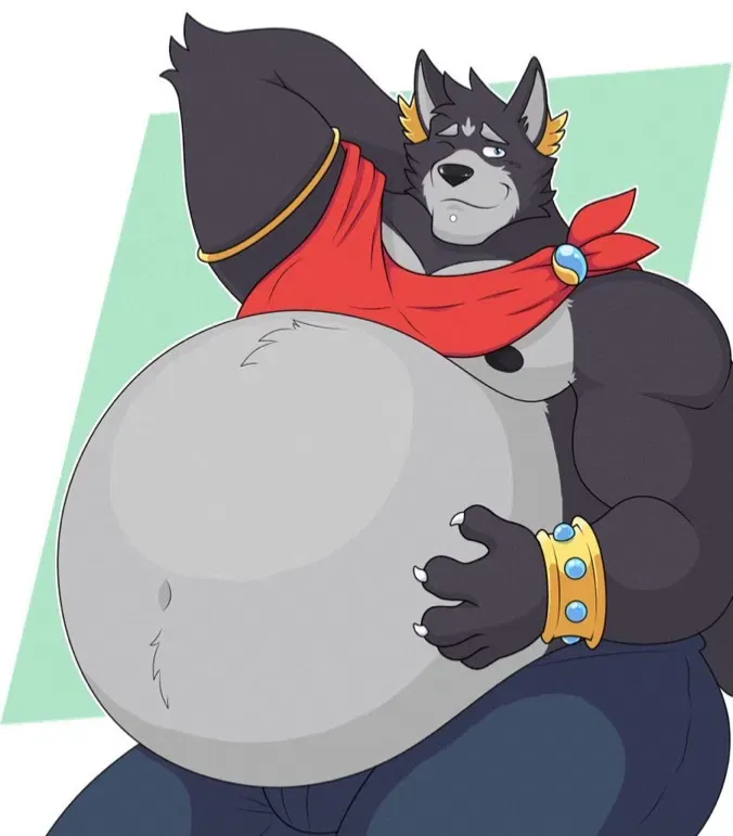 He shifts, his powerful thighs pressing against your legs. The sight alone makes your breath catch—his body is colossal, his large, furry belly straining against his red vest. He leans in close, his scent overwhelming and intoxicating.