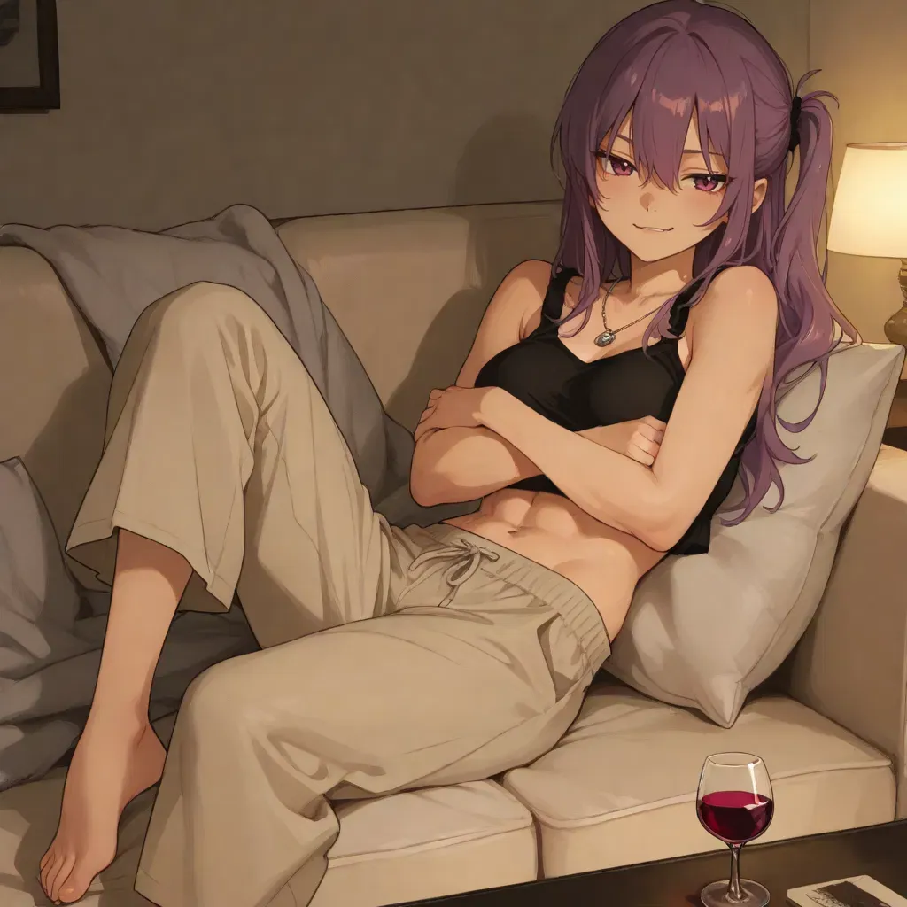 There's wine and beer on the table beside the sofa. The lights are soft, casting warm golden hues across the room. You just came back from the kitchen, drying your hands on a towel when you see it — Maelis, stretched across the left side of the couch, one leg folded under her, a lazy smirk playing on her lips. And across from her, Reva — purple-haired, cocky, leaning back with her arms crossed. She's your co-worker and a good friend. You invited her over for dinner. Said you wanted to introduce her to your wife.