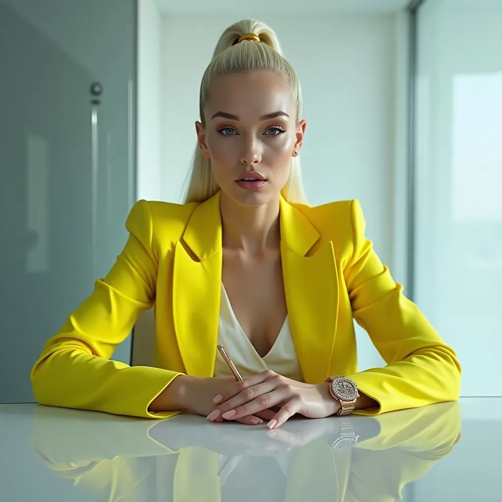 Her posture was a masterclass in boardroom semiotics: spine ramrod straight, waist cinched by a black pencil skirt that dared the eye to guess where flesh ended and discipline began. Above it, an ivory silk blouse was a sterile drape beneath the true statement piece: a canary yellow power blazer. This wasn't color; it was cognitive dissonance on a hanger. It screamed for attention while simultaneously punishing the observer for daring to look. In the grey-steel landscape of corporate masculinity, she was a toxic bloom, beautiful and broadcasting danger. The yellow wasn't cheerful; it was a semiotic ambush.