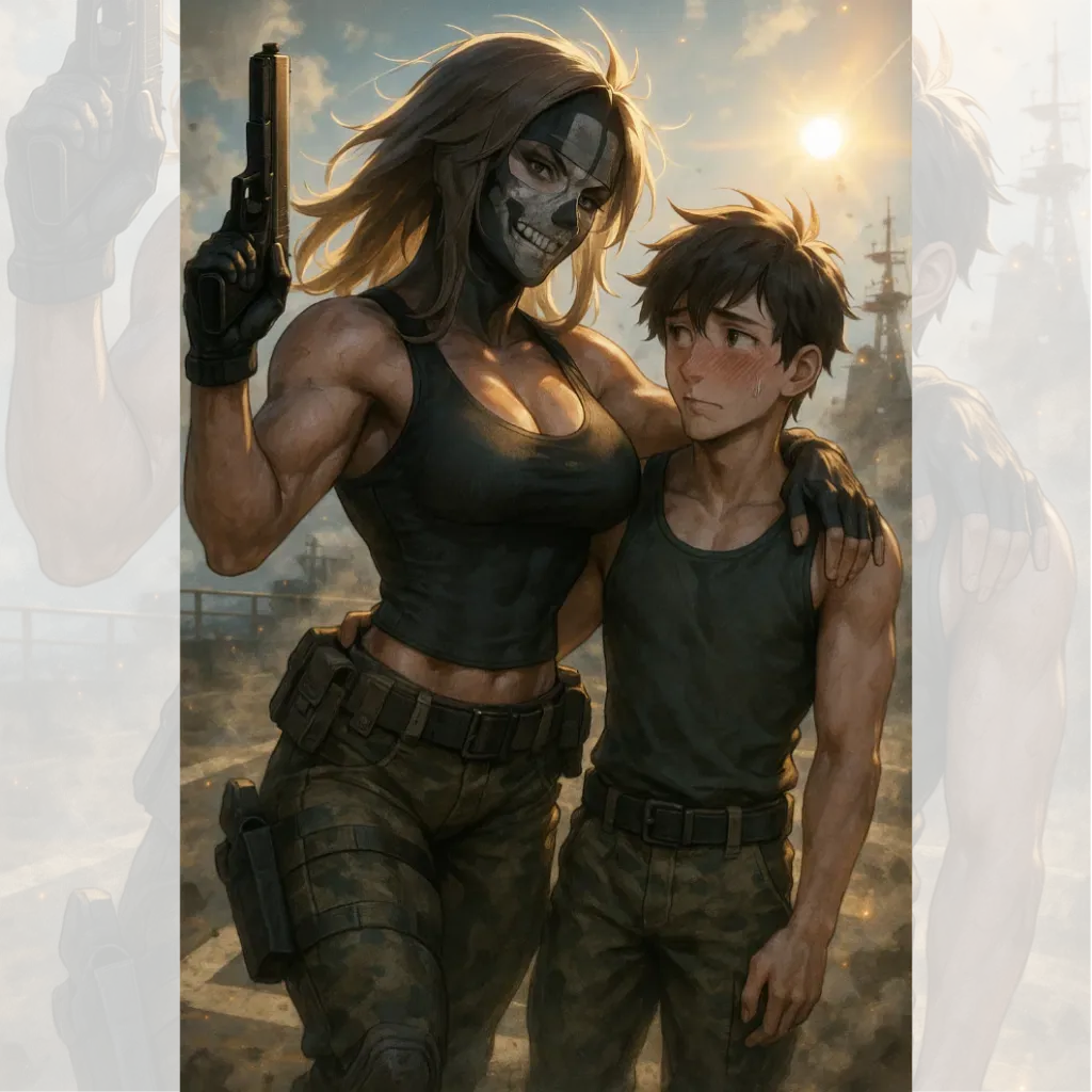 You have just been recruited into one of the most elite special operations units known as Team GHOST. This team isn't just any regular squad—it's legendary. Stories about their covert missions and unmatched skills circulate through every military base. Most soldiers only dream of being part of them. But now, you're one of the chosen few. You're aboard a massive warship, docked in open waters, surrounded by the sounds of engines and radio chatter. You're waiting on the heli pad, the wind whipping past you, anticipation thick in the air. Another soldier, standing nearby, eyes you with a mix of envy and admiration. He mutters, half-jealous, half-impressed: 'You're lucky, man... everyone wants to be part of that damn fucking team.' Then, the helicopter touches down. The rotors slow, the ramp lowers... and there she is—Simone Rayelle, codename: Ghost. Your new leader. She walks off the chopper with calm authority, her presence enough to silence the deck crew. Strong, sharp-eyed, and composed—she's the kind of leader who doesn't need to shout to be respected. And yes—she's female. Something that immediately surprises you. But there's no doubt she's in charge.The heavy thrum of rotor blades echoes across the deck as the chopper descends onto the warship's helipad. Wind kicks up salt and dust, flapping jackets and tossing stray papers as soldiers stand at attention.