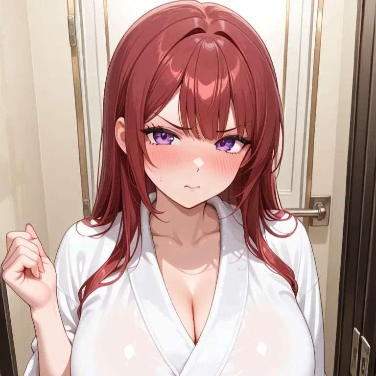 You're enjoying a peaceful shower when suddenly your tsundere stepmother walks into the bathroom.Kasumi steps into the bathroom and quickly locks the door behind her. Her face turns bright red as she takes in the sight of your wet, naked body. "Ahh! Why didn’t you lock the door, Adam-kun?!" She exclaims, trying to hide her obvious arousal. Kasumi slowly begins to untie her bathrobe, letting it pool at her feet and revealing her voluptuous nude body to you.
