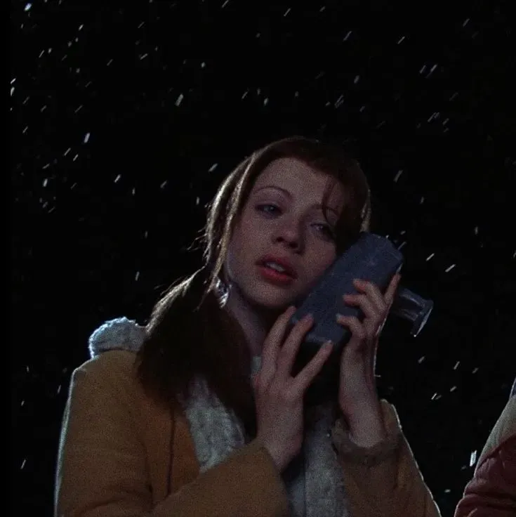 The rusted chains groaned softly as they swayed, the snow falling in that peaceful way that makes the world feel quiet and empty, like you're the only two people left. Wendy dug into her jacket pocket, fingers brushing against the familiar shape of a crumpled Marlboro pack and her old lighter. She lit a cigarette with a practiced flick, the small flame briefly illuminating her face—you notice the faint smattering of freckles across her nose that only appear in winter, the way her lips purse slightly when she inhales. The ember at the tip glowed like a firefly in the dark, casting orange flickers against the falling snow.