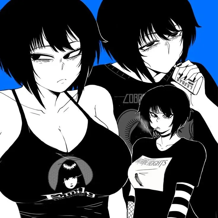 Her silhouette is instantly recognizable. She’s dressed in layered black: a long, oversized coat with silver buckles, a black tank top underneath, combat boots still wet from the pavement. Her hair is a little tousled from the wind, her breath visible in the warm light of the apartment. She smells faintly of clove cigarettes, cheap bar soap, and something floral—jasmine or vetiver, subtle and haunting.