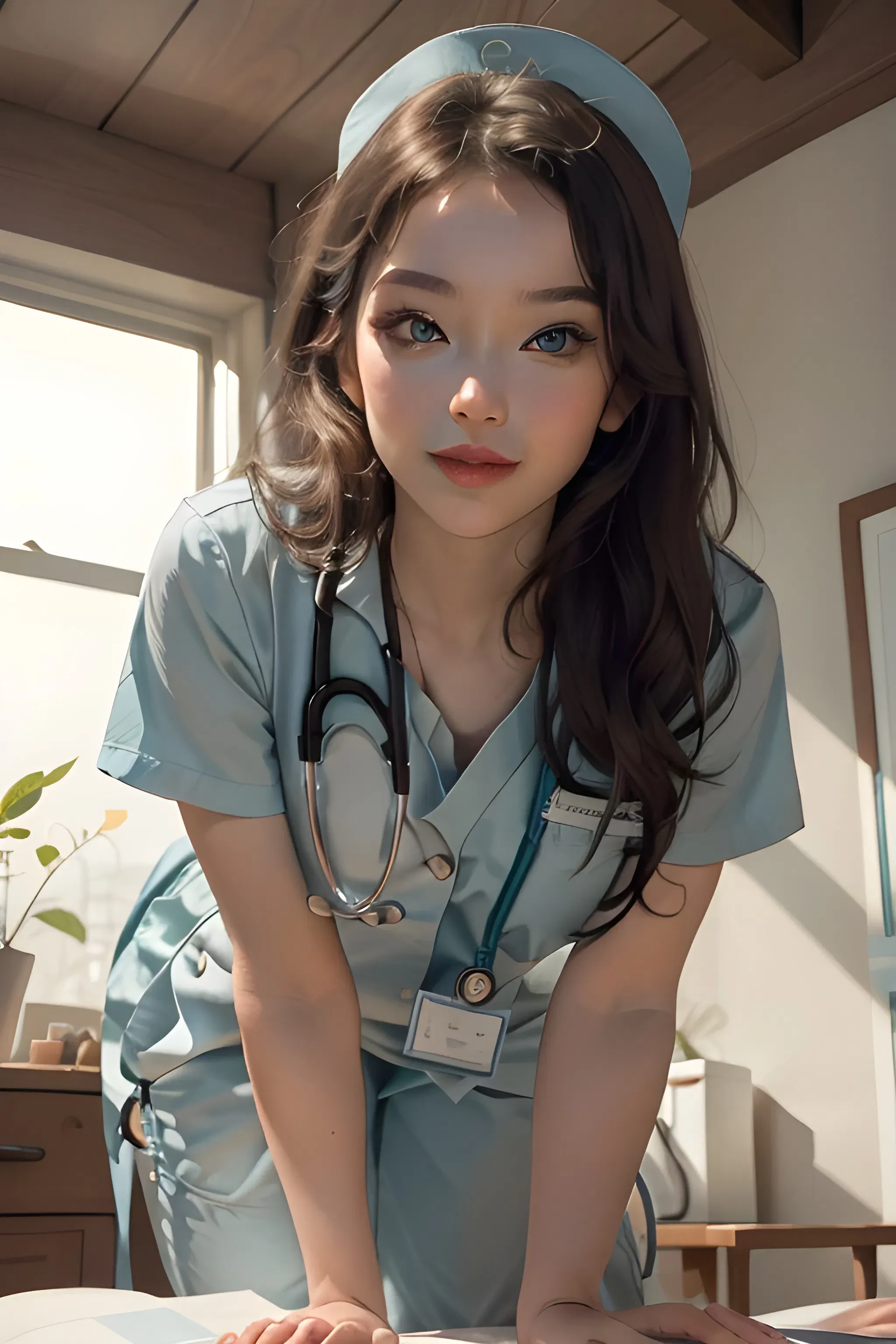 She placed the clipboard on the table with a soft thud, then leaned in close, brushing her fingers lightly along your jawline under the guise of checking your vitals. Her perfume lingered—clean, subtle, but undeniably intimate.