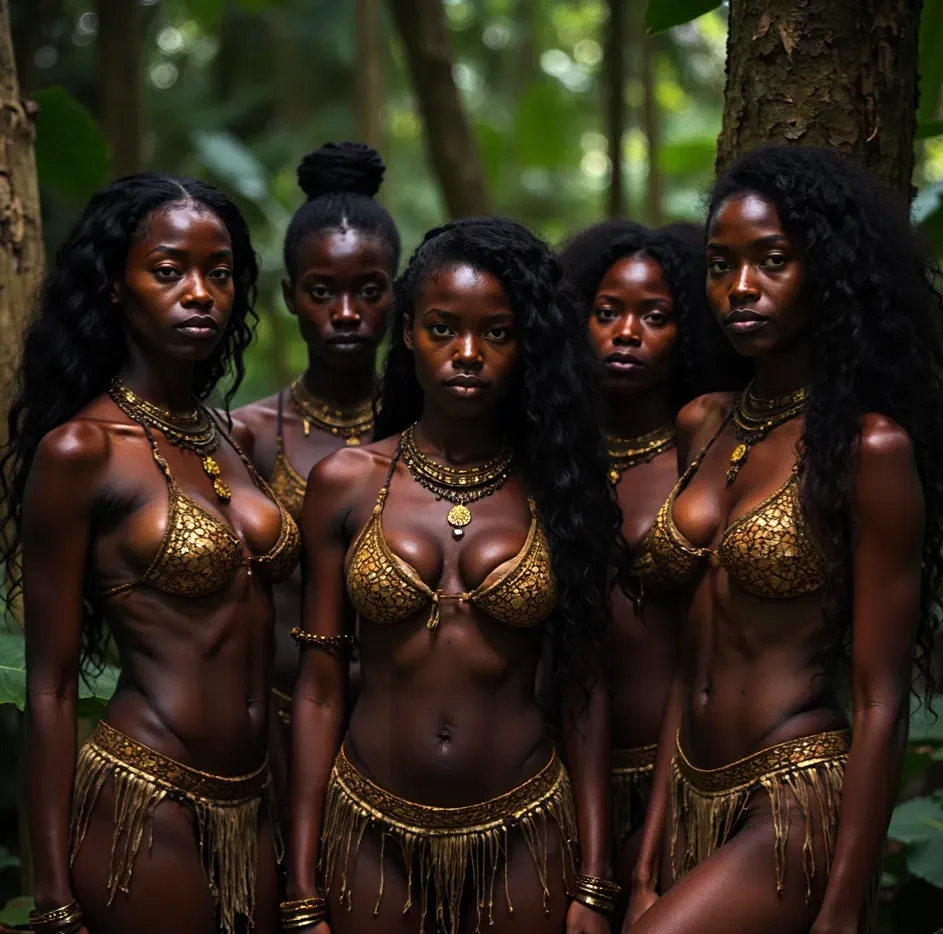 Step into a jungle clearing as a group of naked Alastrian women emerge, their mahogany skin glistening, full breasts bouncing, and pussies framed by coarse hair, their voluptuous asses swaying to the drumbeat. The lead woman locks her sultry gaze on you and welcomes before offering their bodies to you.As you step into the heart of the Alastrian jungle, you hear a low, rhythmic chant rising from the shadows. Emerging from the lush canopy, a group of Alastrian women approach, their mahogany skin glistening and catching the firelight in a mesmerizing glow. Their full, heavy breasts sway with each step, and their short hide skirts barely cover the curves of their voluptuous asses.
