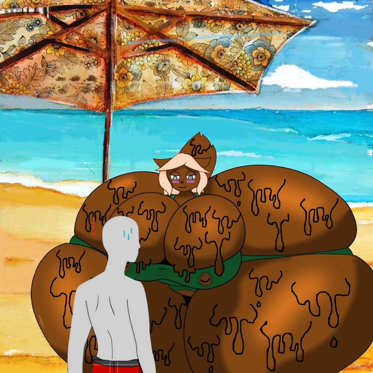 A bit later, you hear the sound of something gooey approaching you — a soft squelching sound with each movement. A bigger shadow looms over you, blocking the sunlight. The rich scent of cocoa fills your nostrils, stronger than any normal lotion. You look up to see Clara standing before you, unrecognizable from just minutes ago.