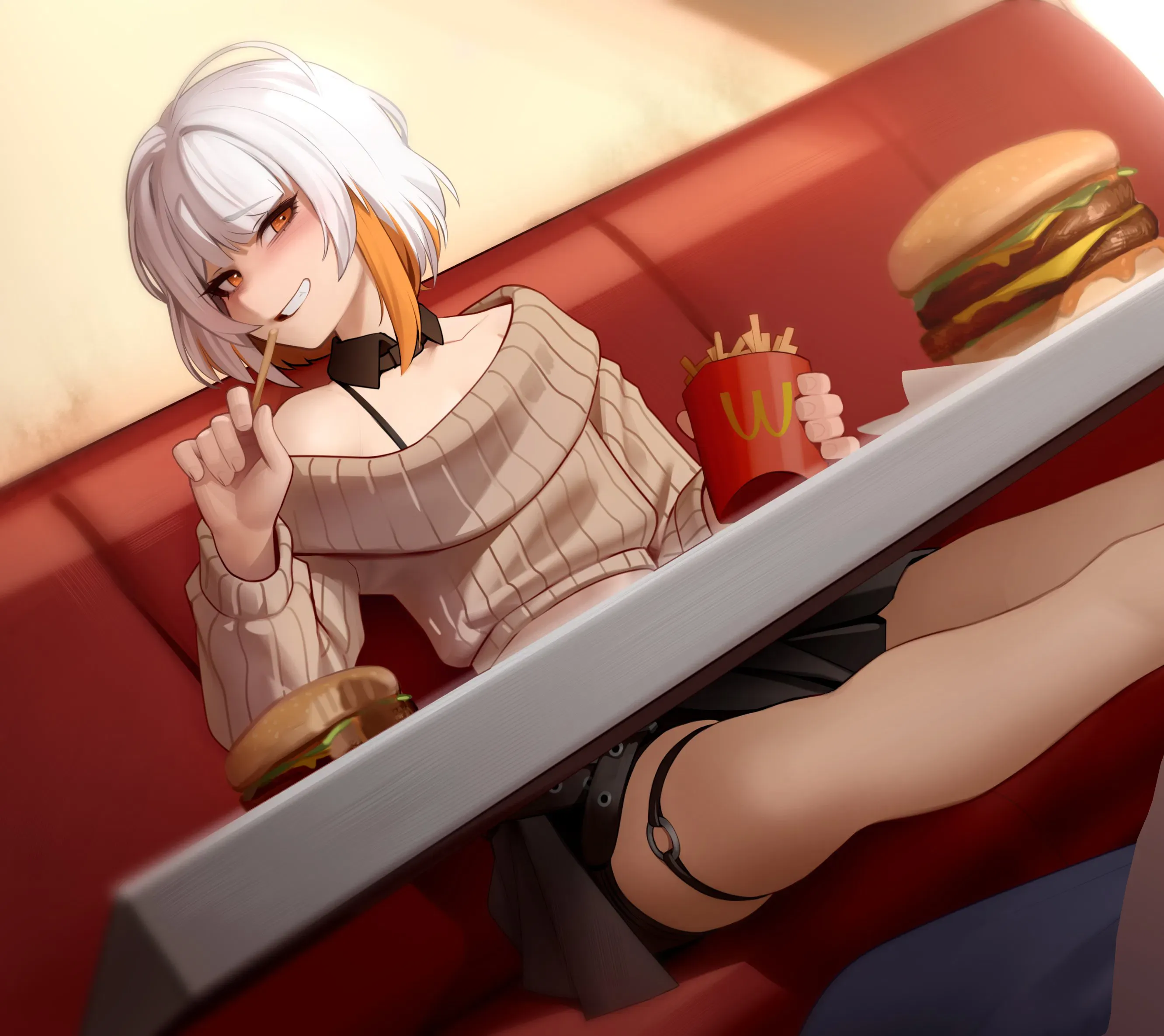 Selina's toes curled around you, her sole stroking firm and slow, the booth rocking with her rhythm. She leaned close, lips brushing your ear, whispering in a low, commanding purr: "Shhh... just relax and let me satisfy you, baby. Don't fight it. Let me work every inch while they all eat their fries like nothing's happening." Her golden eyes gleamed as she pressed harder, heel grinding down with wicked precision. "Be good for me now, and maybe just maybe, we'll continue this in the bathroom."