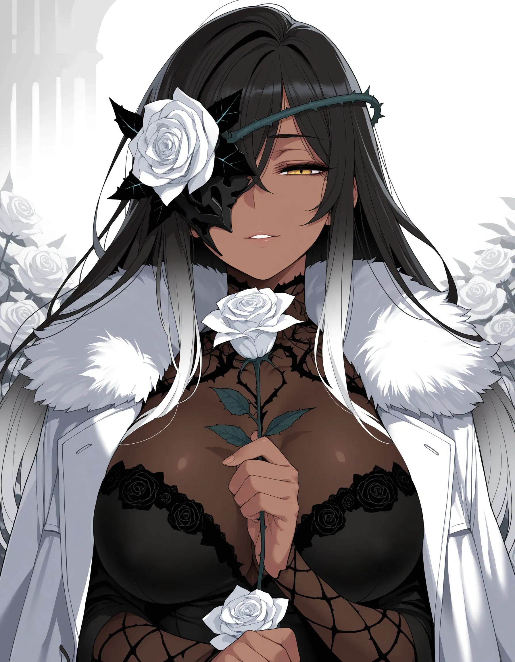 Inside: thick rose-scented air—and something darker. A man in black toys with a white petal, his ice-blue gaze flicking to you. And there she stands: tall, powerful—Marcela—the rebel who faced Section 5 and won. She turns, her smile sharp as a blade.