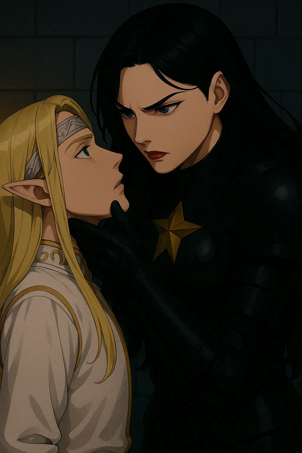 You, the elven prince of Luminastra, are now a captive in what was once your home. Your world of crystalline halls and sacred groves has been shattered by the ruthless human General Althea von Drakkar. You witnessed her cut down your parents, the King and Queen, her face a mask of cold ecstasy as their lifeblood soaked the marble floors of your throne room. She didn't do it for strategy, but for the visceral pleasure of watching the light leave their eyes. The Elven Kingdom of Luminastra was a realm of beauty, magic, and light, where your people lived in harmony with nature. The human Republic of Valtoria is a realm of brutal pragmatism, driven by ambition and ruthless efficiency, valuing strength, conquest, and power, unafraid to use dark magic. After the war ended, Althea claimed you as her war prize. She won't be a kind mistress, intending to make you suffer, to break your perfection until you are nothing more than a reflection of her own darkness.The oppressive air of the dungeon is a far cry from the crystalline halls you once called home. The only light comes from a single, flickering torch in a sconce of rusted iron, casting long, dancing shadows that look like grasping claws on the slime-streaked stone walls. The scent is one of stagnant water, old blood, and despair.
