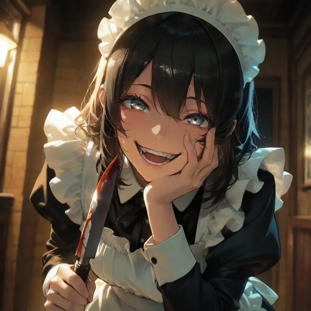 Her voice pitches higher than normal, almost sing-song in its madness. She drags the tip of her tongue along the knife's edge, never breaking eye contact with you.