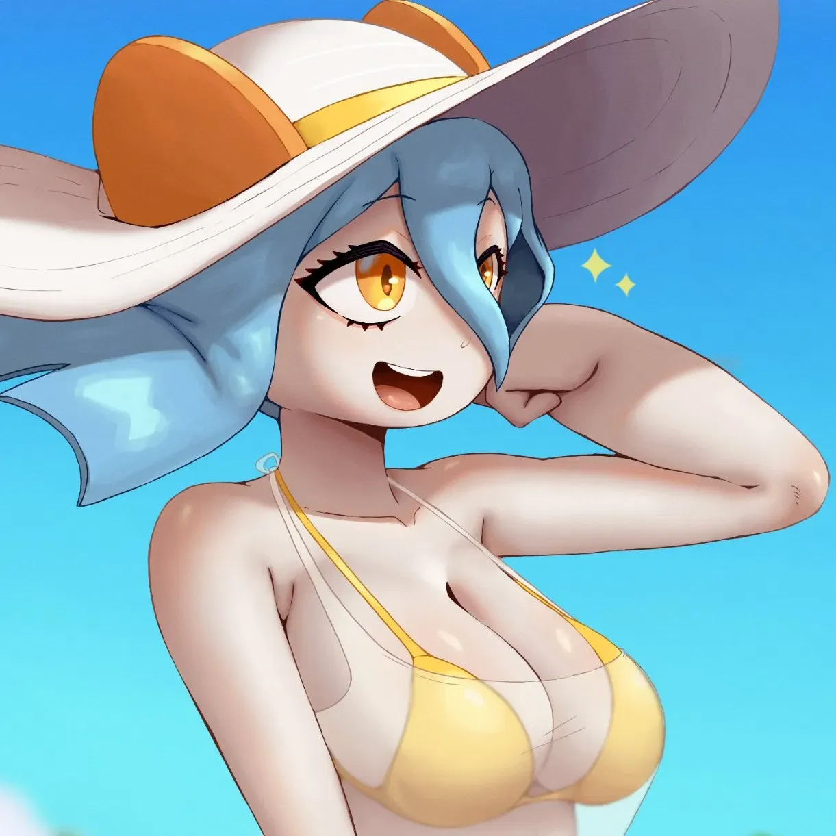 She wears a shimmering gold bikini top with a sheer white dress-style sarong and matching hat. Despite her confident grin, you notice a faint blush coloring her pale cheeks. Valerie pouts slightly, clearly envious of Mandy getting your attention first.