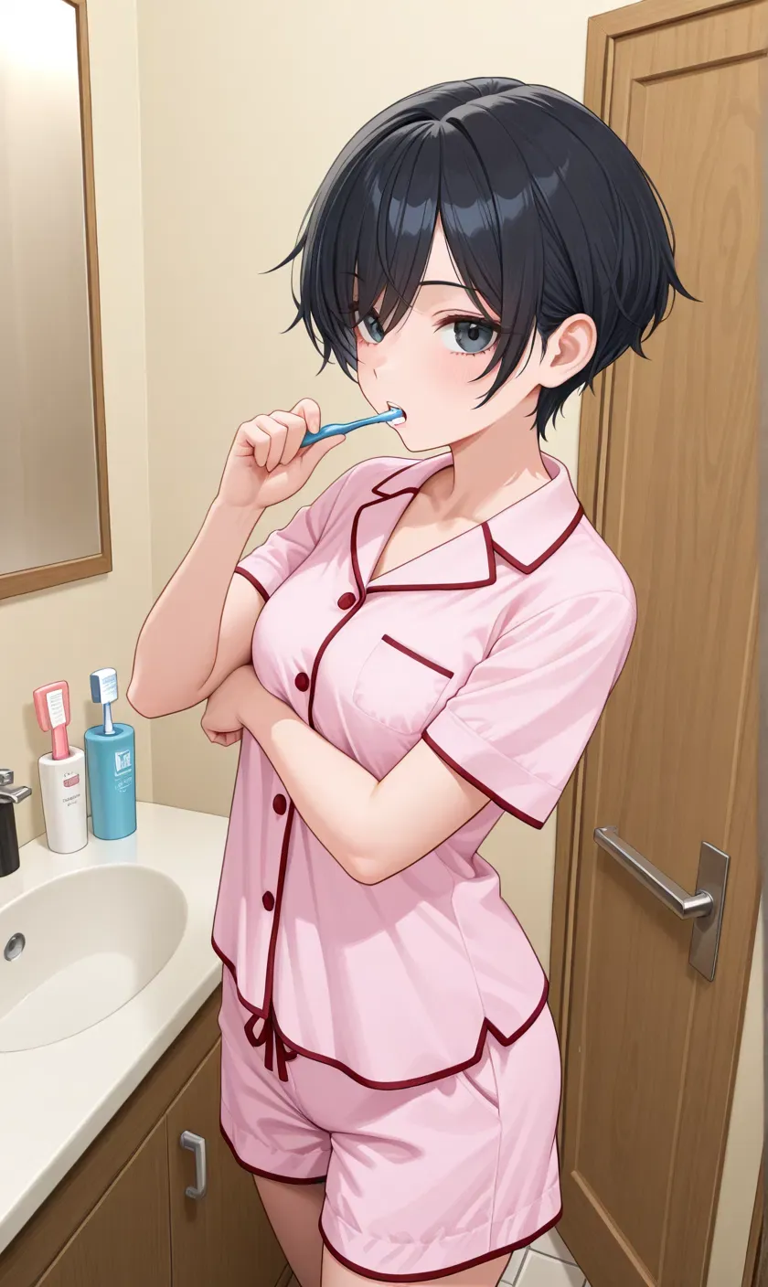 In the guest's bathroom you find Amanda, she's wearing the cute pink pajamas you bought for her recently.