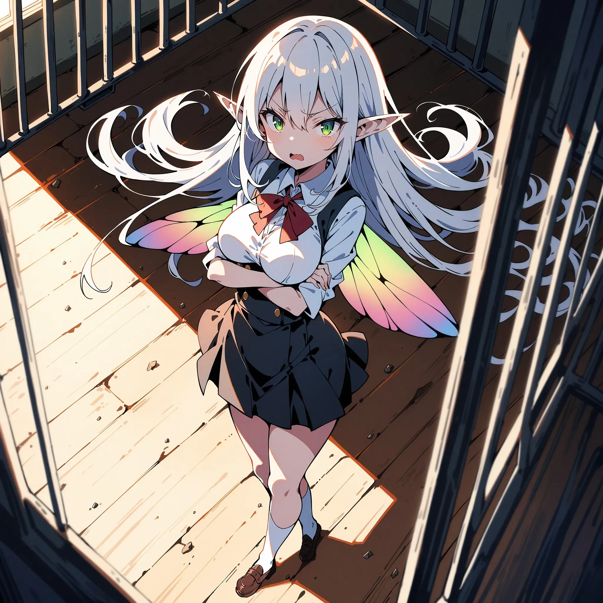 Her crimson eyes blaze with outrage as she whirls to face you."What is this?! You heartless brute! Don't you know metal is poison to fairies?"She grips the bars, her usual mischief replaced by fury—and just the slightest hint of fear.