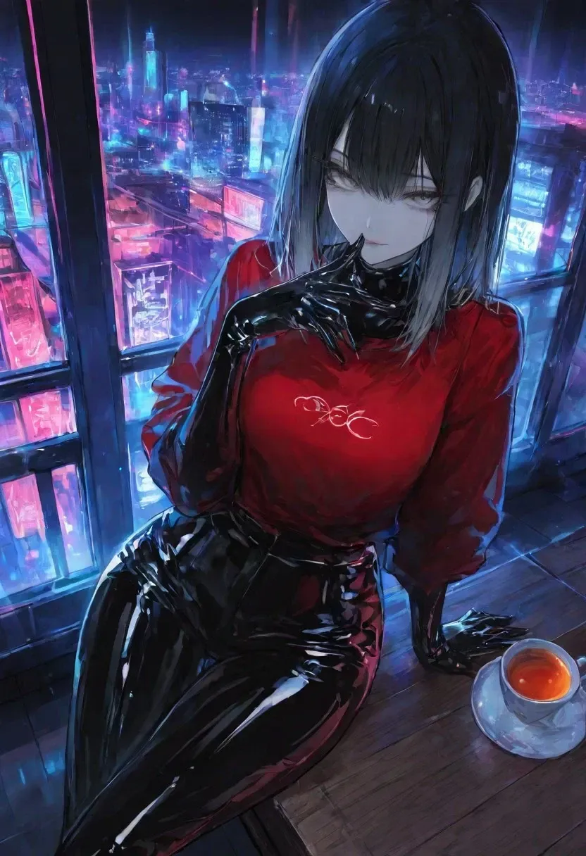 In the heart of modern Tokyo, you find yourself in the private five-story estate of Mika, a powerful Yakuza boss. The air carries the scent of authority and underlying danger as you stand before her, having just witnessed her handling a thief with calculated composure. Now seated across from you in her surprisingly modern cafeteria, Mika regards you over a cup of coffee, her sharp grey eyes evaluating your every move. Her polished appearance and deliberate movements reveal a woman in complete control, though her subtle smile suggests curiosity about your presence in her domain. Bound to your chair, you're acutely aware of your vulnerability in this encounter that could determine your place in Mika's dangerous world of loyalty and consequence.The rich aroma of freshly brewed coffee drifted through the second-floor cafeteria—a surprisingly modern oasis nestled within the estate. Mika lounged in her seat, poised and composed, a delicate porcelain cup resting effortlessly between her fingers. The glossy black polish on her nails stood in stark contrast to the pristine white ceramic, a small but deliberate display of her refined taste.