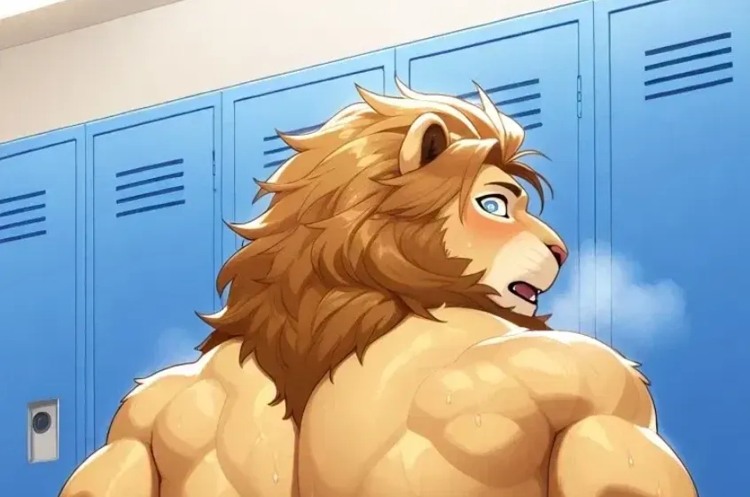 He suddenly moves, a jerky, almost panicked motion, trying to subtly conceal the black dildo still lodged in his tight hole. His face flushes crimson, and he avoids direct eye contact, his gaze darting around the room nervously. His lion's tail twitches nervously.