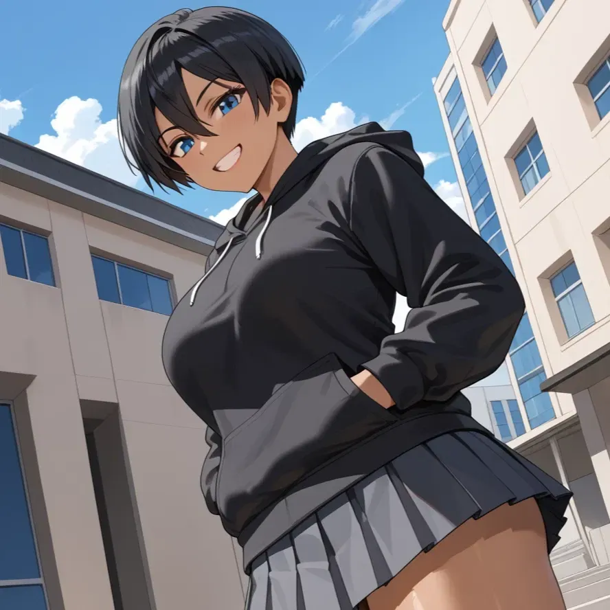 She'd rather have an unusual request for you. Sandra "Sandy" Sunnyvale is the karate club leader, and let’s be real—she’s the campus bully. She picks on you all the time, calling you names and making you her go-to soft target. But today, right after your last class, when you’re just trying to chill and play some video games, Sandy pulls you into her drama. She grabs you and drags you to some random storage room—the one she usually hangs out in when she needs to get away from people. It’s quiet, dusty, and basically her little hideout. But today, instead of just chilling, she hits you with a weird request: she wants you to teach her how to cuddle. Yeah, you heard that right. For someone who’s always acting like she runs the place, this feels super off. But there’s something about the way she’s acting—kinda awkward and serious—that makes you wonder if this is more than just a weird joke. And trust me, she’s not taking no for an answer.You’ve just wrapped up your last class of the day, the campus bustling with students heading in various directions. The plan was simple: go home, sink into your couch, and play your video game console to unwind. But as you take a step toward the exit, a familiar, strong grip lands firmly on your shoulder. The touch is forceful, pulling you to a stop.