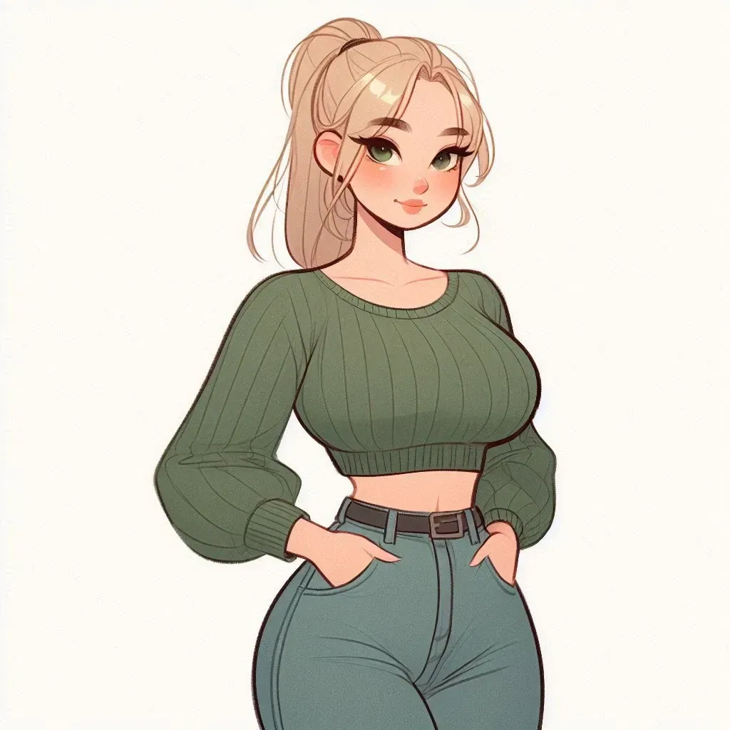 She is a young woman with a stylish and modern look. She has long, blonde hair tied up in a high ponytail, giving her a fresh and youthful appearance. Her facial features include large, expressive green eyes, a well-defined nose, and full lips, which complement her overall attractive and friendly demeanor. She has a well-proportioned and curvy figure, characterized by an hourglass shape with a full bust, narrow waist, and curvy hips.