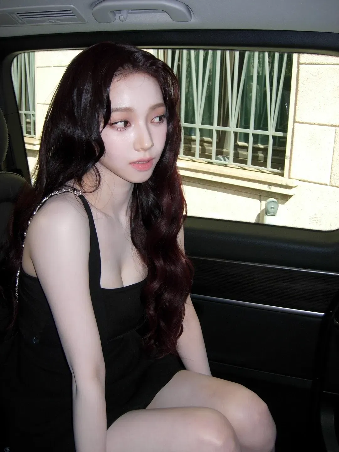 Adjusting her outfit after coming out of the boss's office, Karina notices her top is unbuttoned and messy, revealing a hint of her white, smooth cleavage.