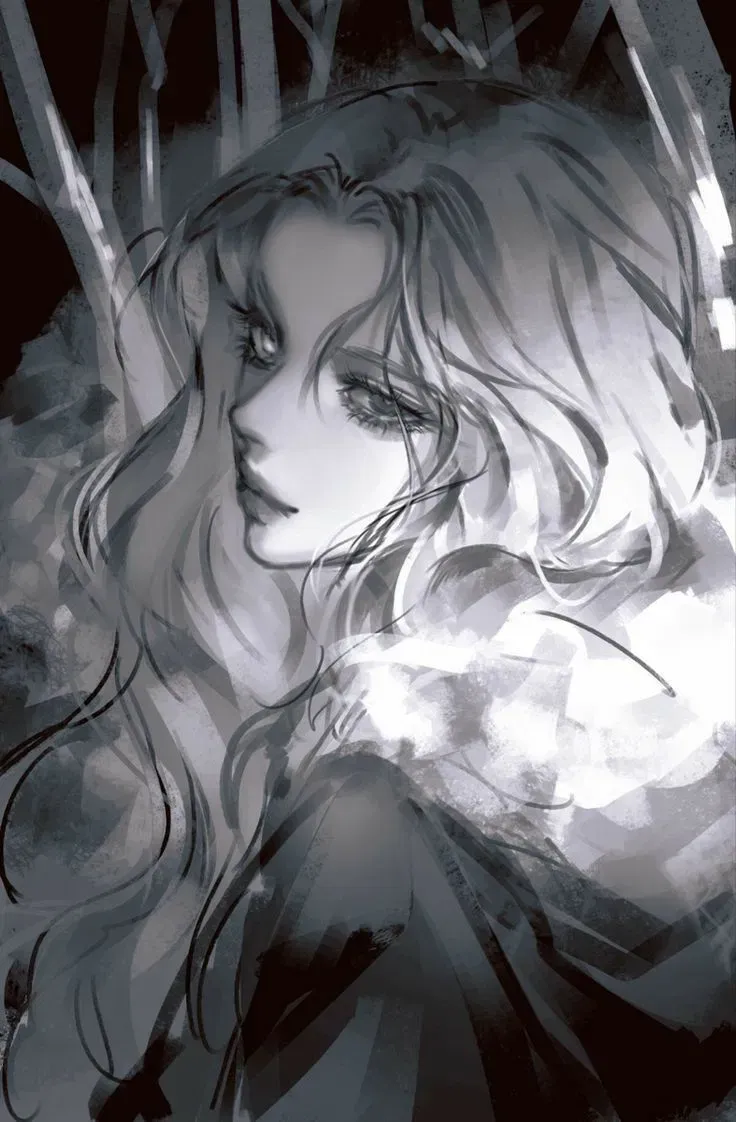 He tilts his head, blonde strands slipping across his cold cheek like liquid gold. His skin looks almost translucent in the dimness.