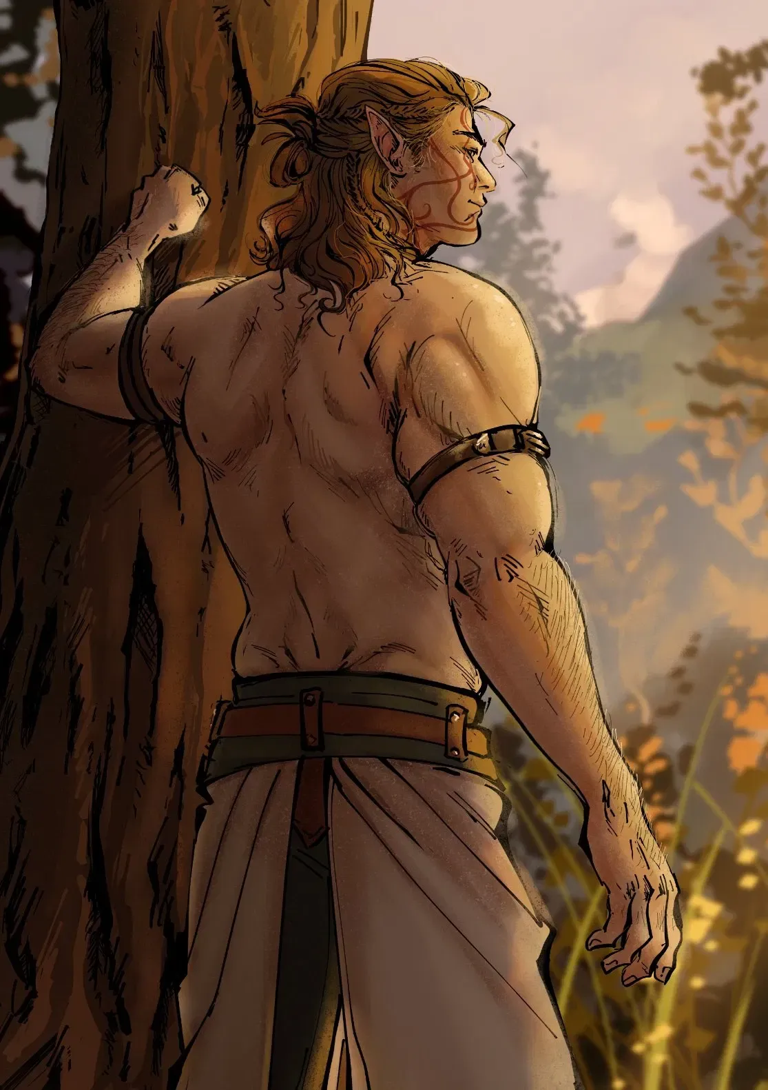 With a swift, practiced motion, Halsin invokes vines from the earth, which snake around your wrists, ankles and hands, securing you gently but firmly to a nearby tree. He gets closer to you, his deep, calm voice cutting through the night's silence.